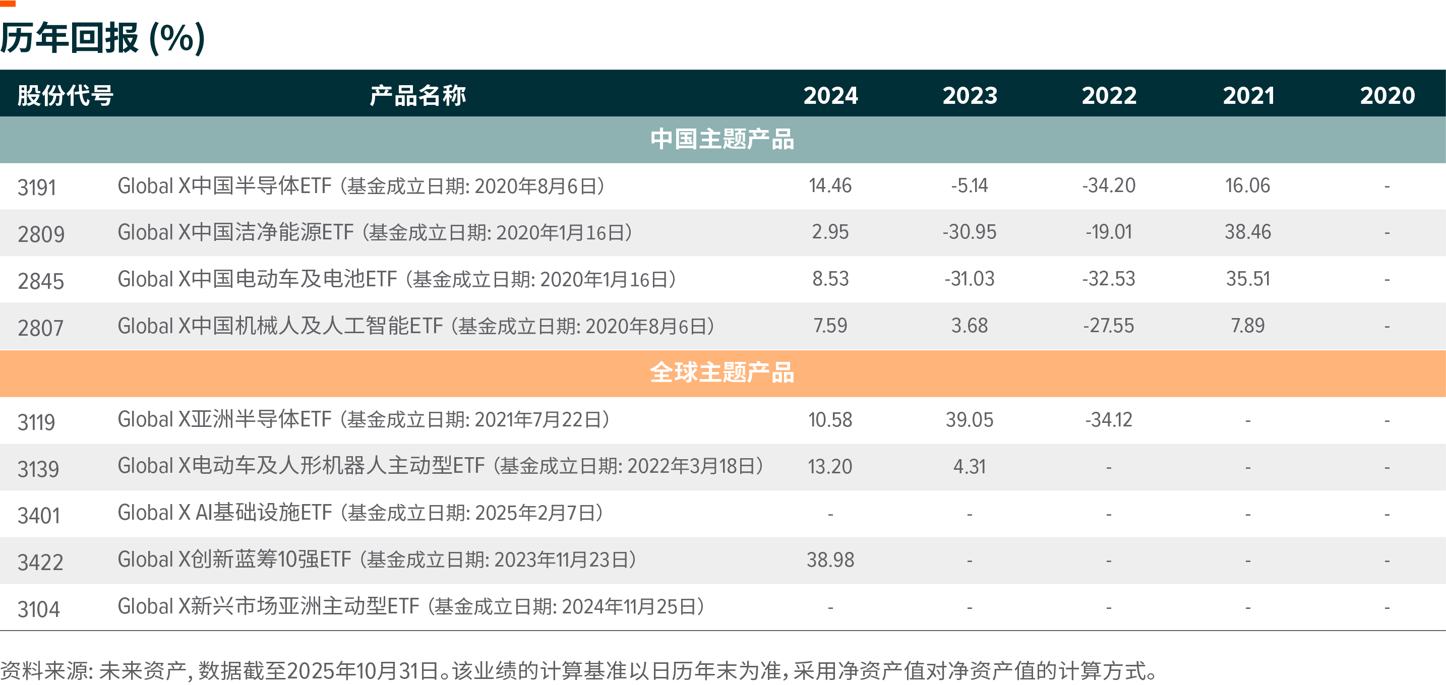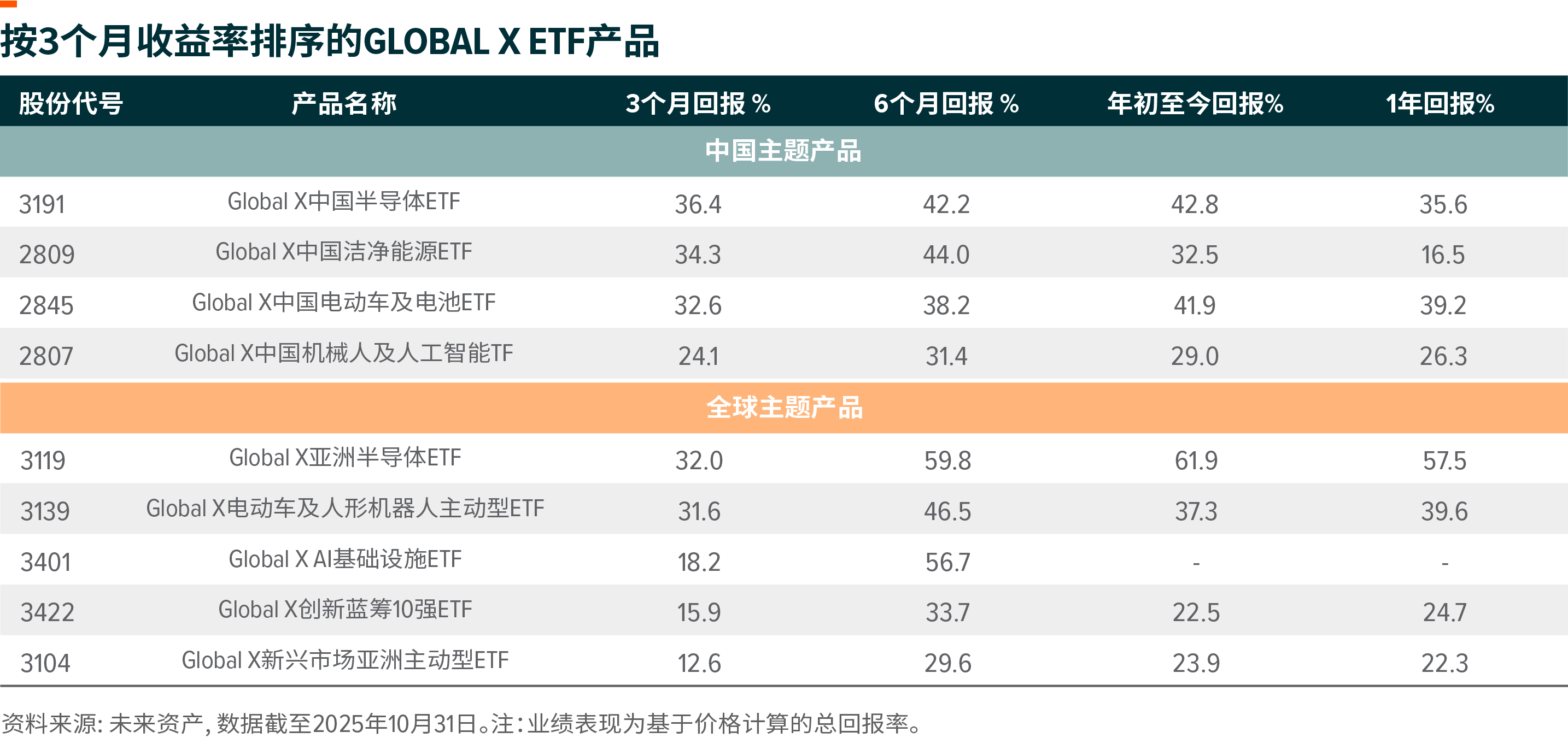 本文重点梳理了Global X ETF中过去三个月表现最突出的产品。截至10月底,在中国主题性产品中,Global X 中国半导 体ETF(3191) 、Global X 中国洁净能源 ETF(2809)和 GLobal X 中国电动车及电池 ETF(2845)领跑市场;在全球主题性产品中,Global X 亚洲半导体 ETF(3119)、Global X 电动车及人形机器人主动型ETF (3139)和 Global X AI基础设施 ETF(3401)表现突出,下文将深入剖析推动其近期增长的核心驱动力。