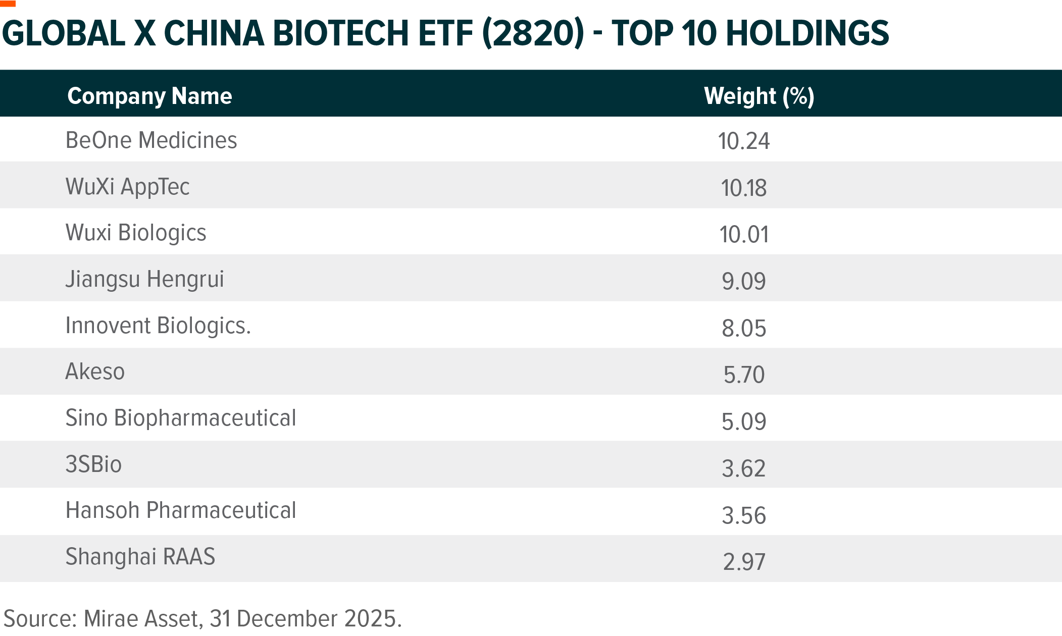 - The investment objective of Global X China Biotech ETF’s (the “Fund”) is to provide investment results that, before fees and expenses, closely correspond to the performance of the Solactive China Biotech Index.