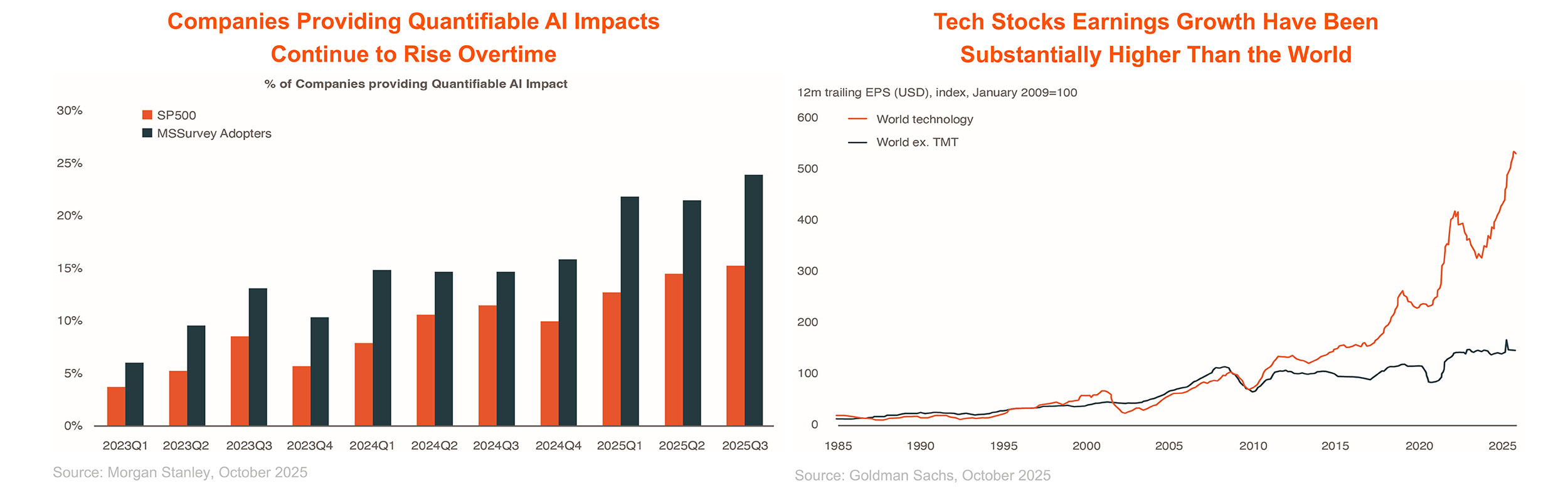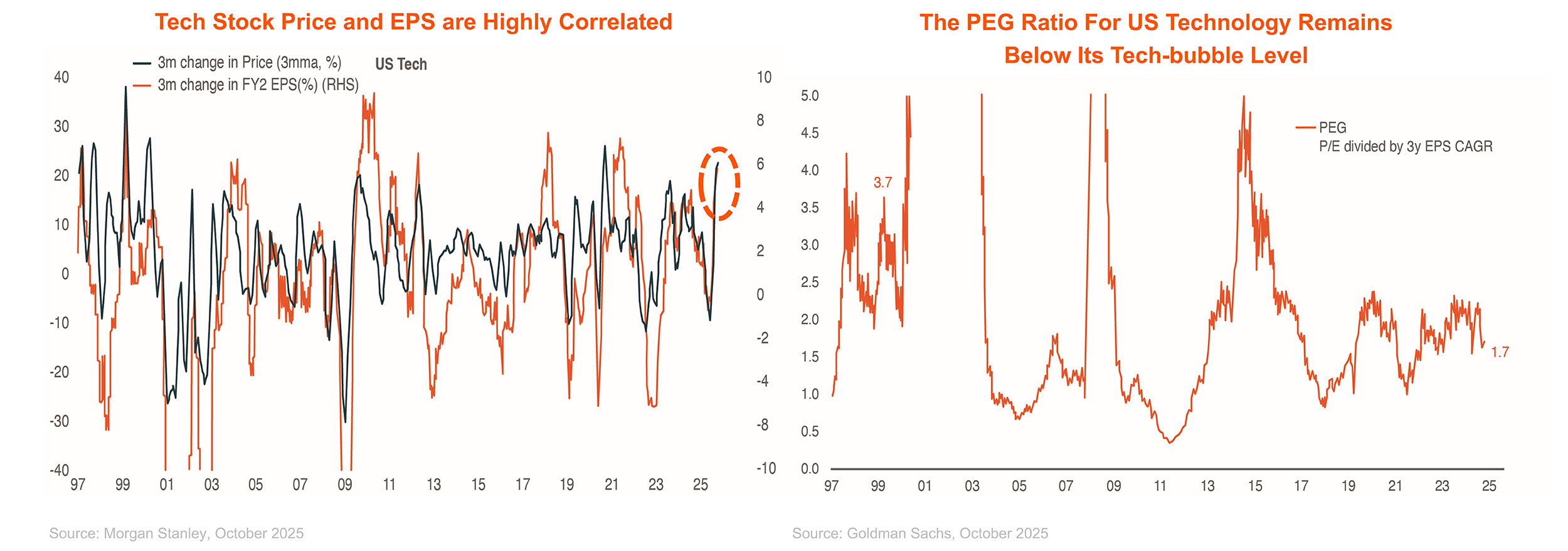 - There could be volatility ahead for US market. On the one hand, US large tech are delivering strong revenue and earnings growth, and reiterating commitments to AI investments.
