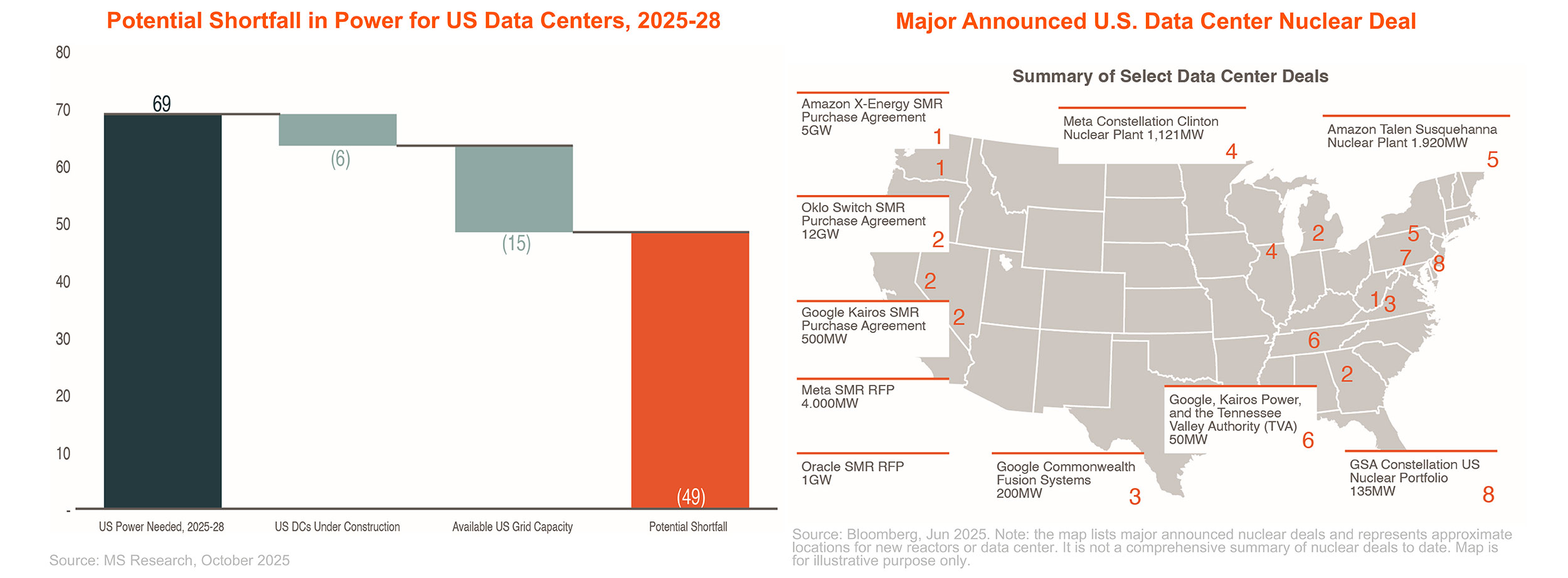 - MS projects a 49 GW shortfall in U.S. power generation capacity by 2028, directly attributable to data center demand.