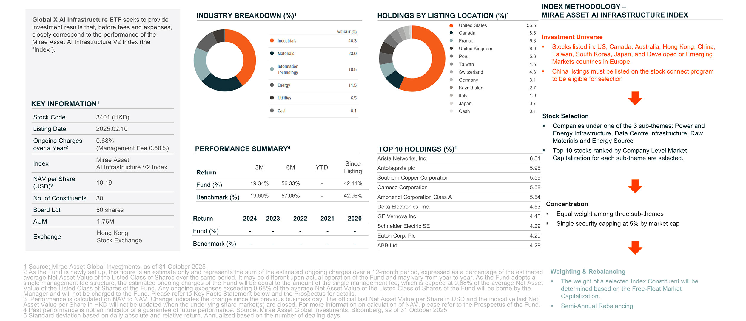 - The investment objective of Global X AI Infrastructure ETF (the “Fund”) is to provide investment results that, before fees and expenses, closely correspond to the performance of the Mirae Asset AI Infrastructure V2 Index.
