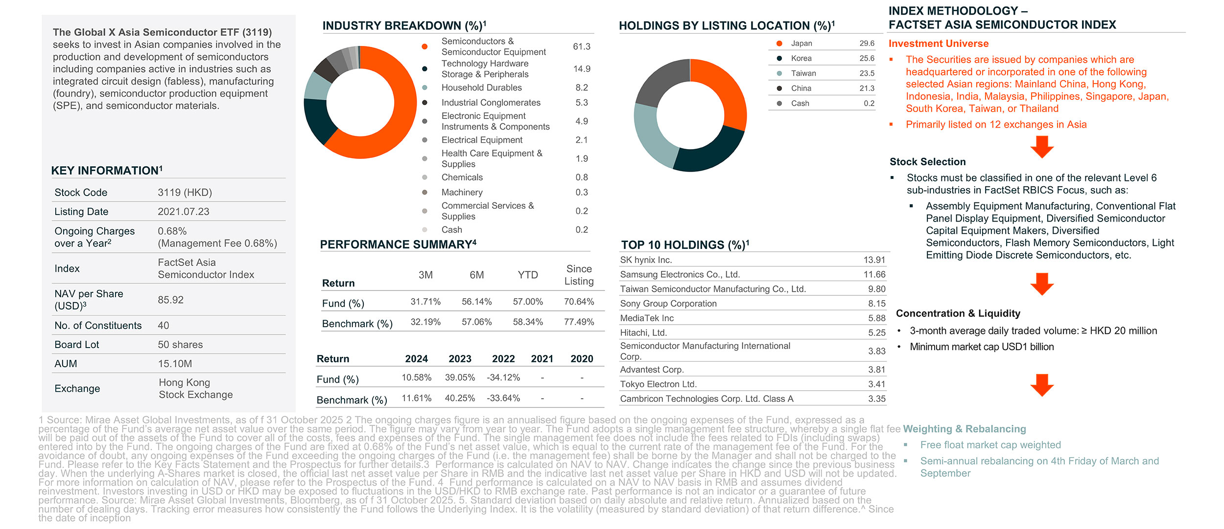 Recent developments underscore this thesis. Google’s TPU has validated its performance through Gemini and is now positioned for third-party commercialization—a credible challenge to Nvidia’s dominance. Amazon and others are accelerating proprietary chip development. Yet regardless of design, manufacturing remains concentrated in Asia: TSMC for fabrication and SK Hynix for HBM supply. Historically, NVIDIAcaptured most of the AI value chain economics; going forward, Asian semiconductor manufacturers are poised to claim a larger share: Global X Asia Semiconductor ETF (3119 HK)