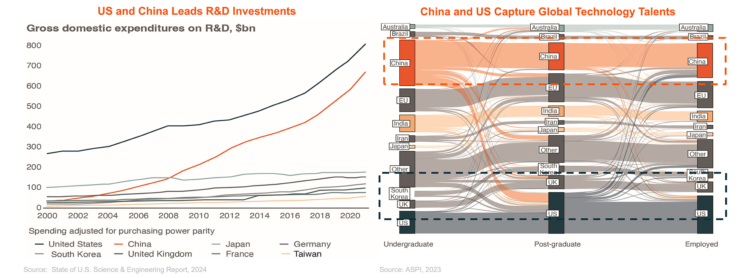 - US and China leaderships are characterised by their substantial investments in R&D and abundant talents