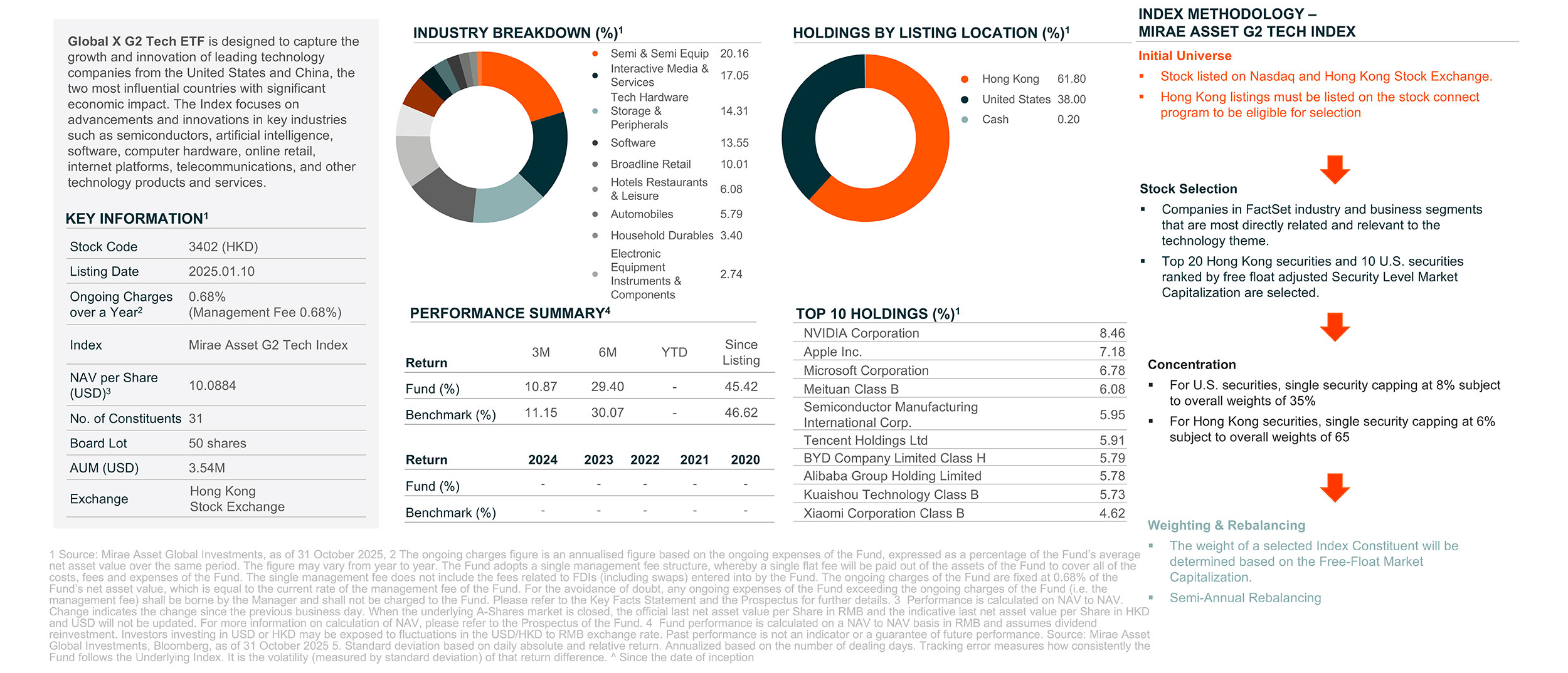 - The investment objective of Global X G2 Tech ETF (the “Fund”) is to provide investment results that, before fees and expenses, closely correspond to the performance of the Mirae Asset G2 Tech Index.