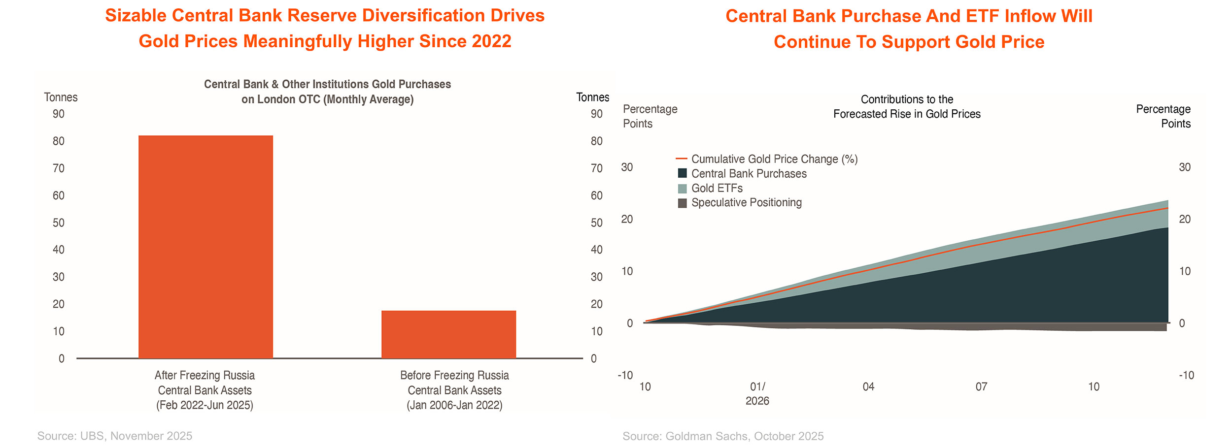 Historically, global crises have reinforced U.S. dollar strength as investors flocked to safe-haven assets. However, recent structural trends suggest this pattern may not hold in the next downturn. Over the past decade, significant U.S. asset purchases by trade surplus economies have supported the dollar. Should risk sentiment reverse, repatriation flows could weaken this support, challenging dollar resilience. While a softer dollar may partially offset earnings risk for U.S. corporates—given that approximately 50% of NASDAQ 100 revenues are generated outside the U.S.—U.S. Treasuries remain vulnerable to currency depreciation, adding complexity to fixed-income allocations. Global X Nasdaq 100 Covered Call Active ETF (3451 HK) & Global X S&P 500 Covered Call Active ETF (3415 HK) offer a pragmatic hedge. This strategy combines equity exposure with option premium income, providing a cushion against potential market corrections while capitalizing on heightened volatility. Gold is likely to remain a good hedging tool against the dollar in 2026