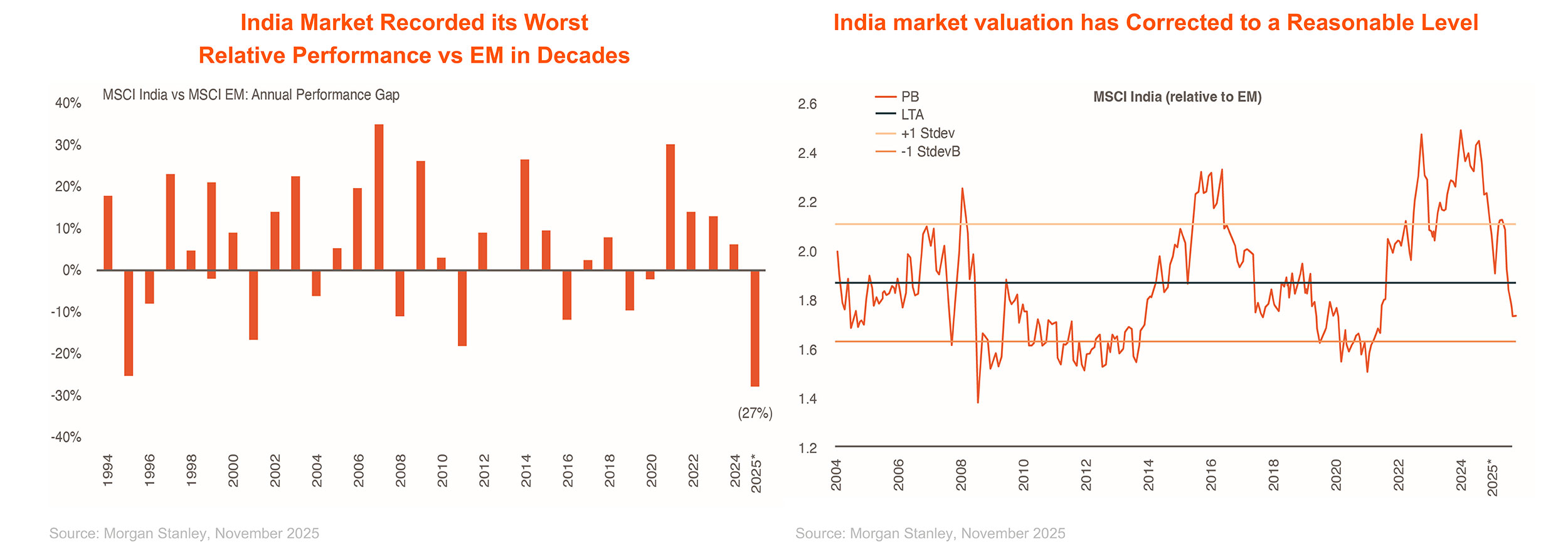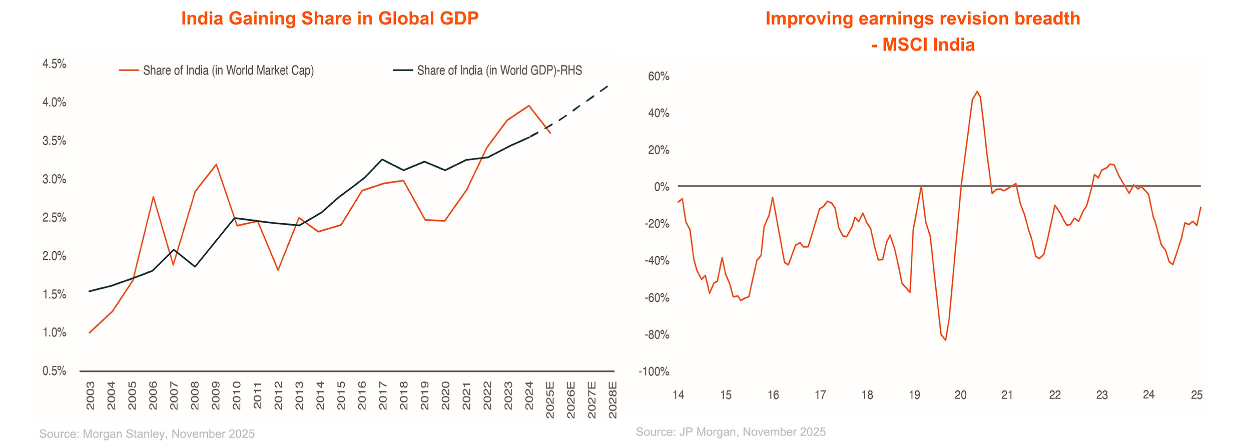 - Catalysts for a potential rebound include: 1. a potential US-India trade deal 2. a positive growth cycle backed by fiscal and monetary support, 3. mid-teens earnings growth, and 4. improved valuations