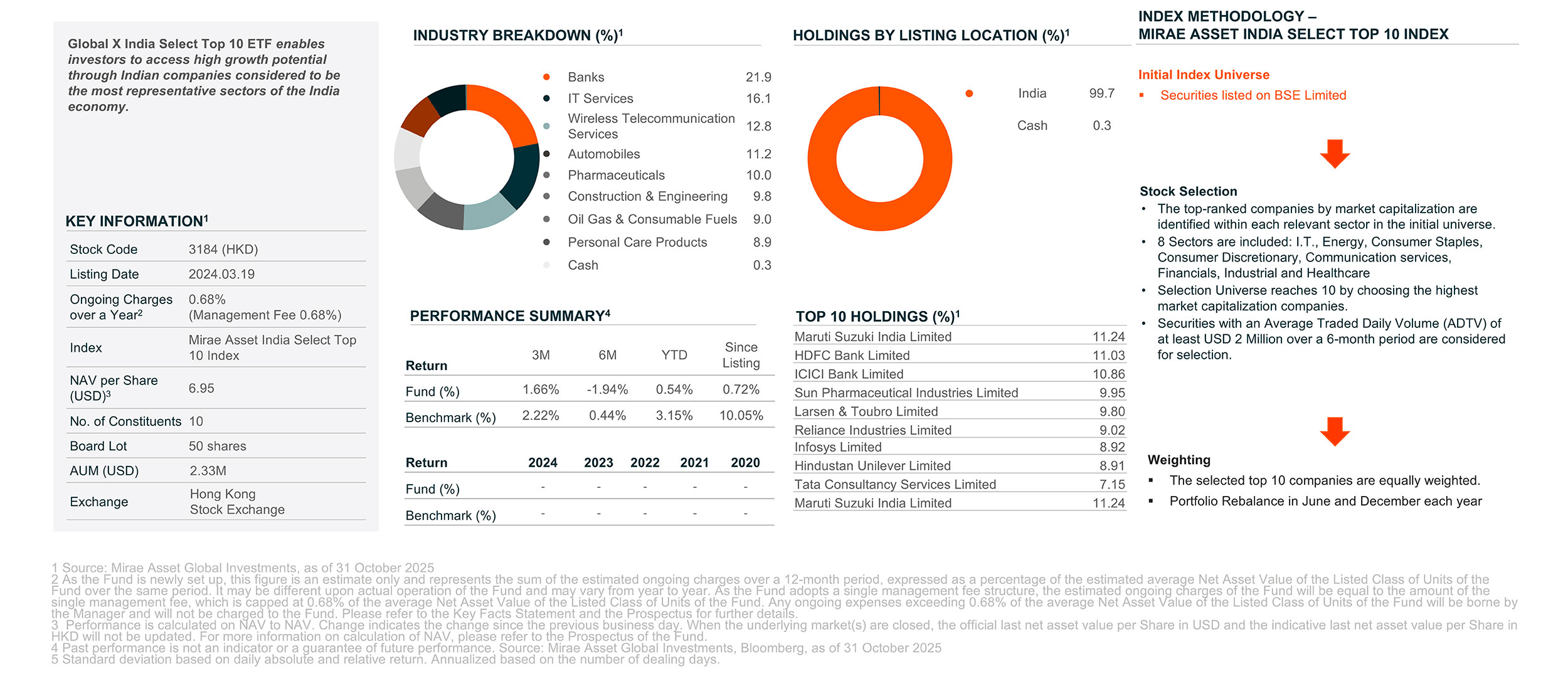 - The investment objective of Global X India Select Top 10 ETF (the “Fund”) is to provide investment results that, before fees and expenses, closely correspond to the performance of the Mirae Asset India Select Top 10 Index.