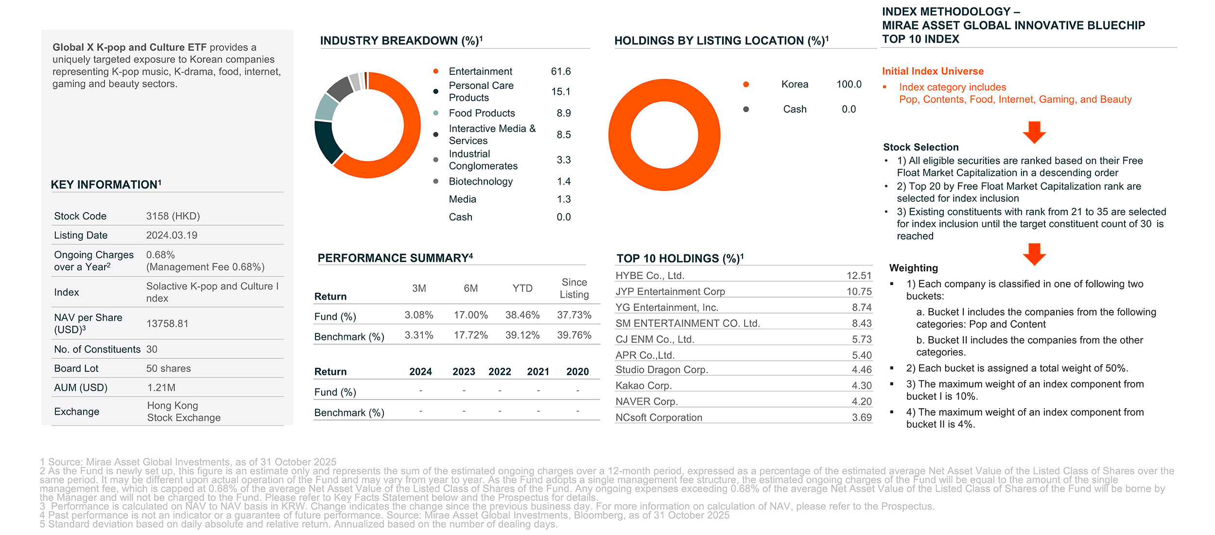 - The investment objective of Global X K-pop and Culture ETF (the “Fund”) is to provide investment results that, before fees and expenses, closely correspond to the performance of the Solactive K-pop and Culture Index.