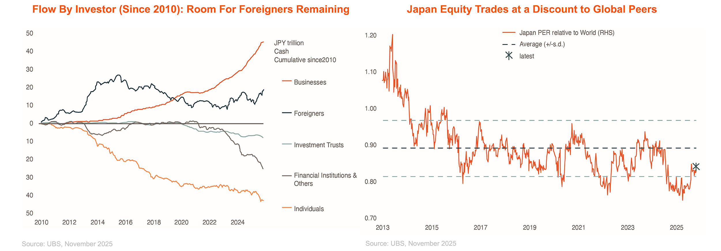 - The Japanese equity story is driven by multiple factors, including domestic economy reflation, equity market structural reforms (TSE reforms), increase in foreign investor inflows, and resilient exports.