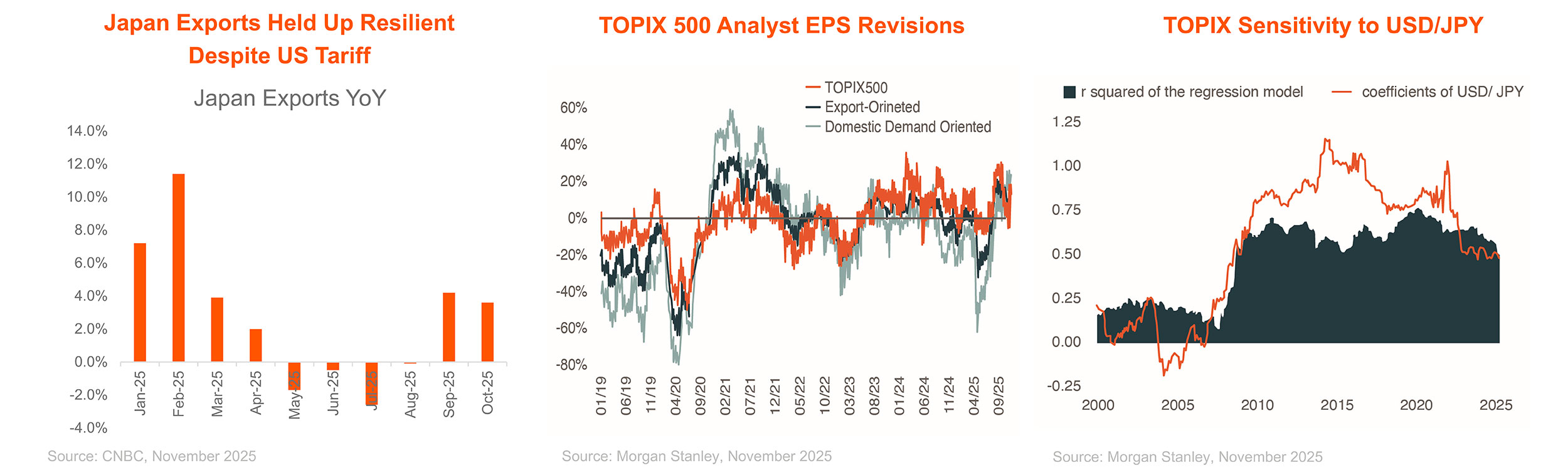 - Despite US tariff uncertainty, Japan export holds up resilient YTD, driven by solid growth in export to other regions. EPS estimates for exporters revised up substantially from April trough, providing share price supports.