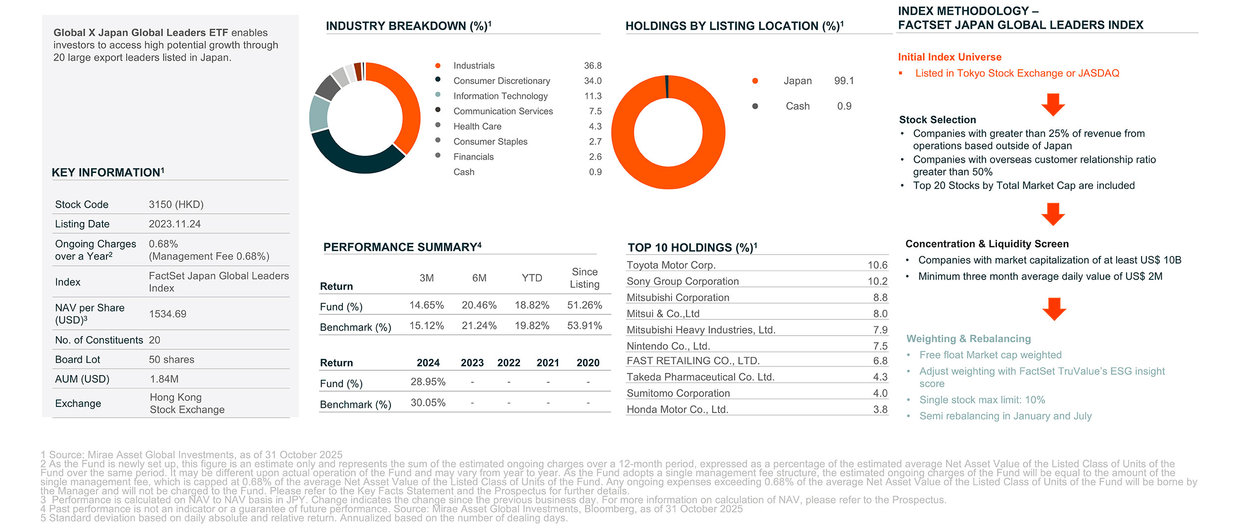 - The investment objective of Global X Japan Global Leaders ETF (the “Fund”) is to provide investment results that, before fees and expenses, closely correspond to the performance of the FactSet Japan Global Leaders Index.