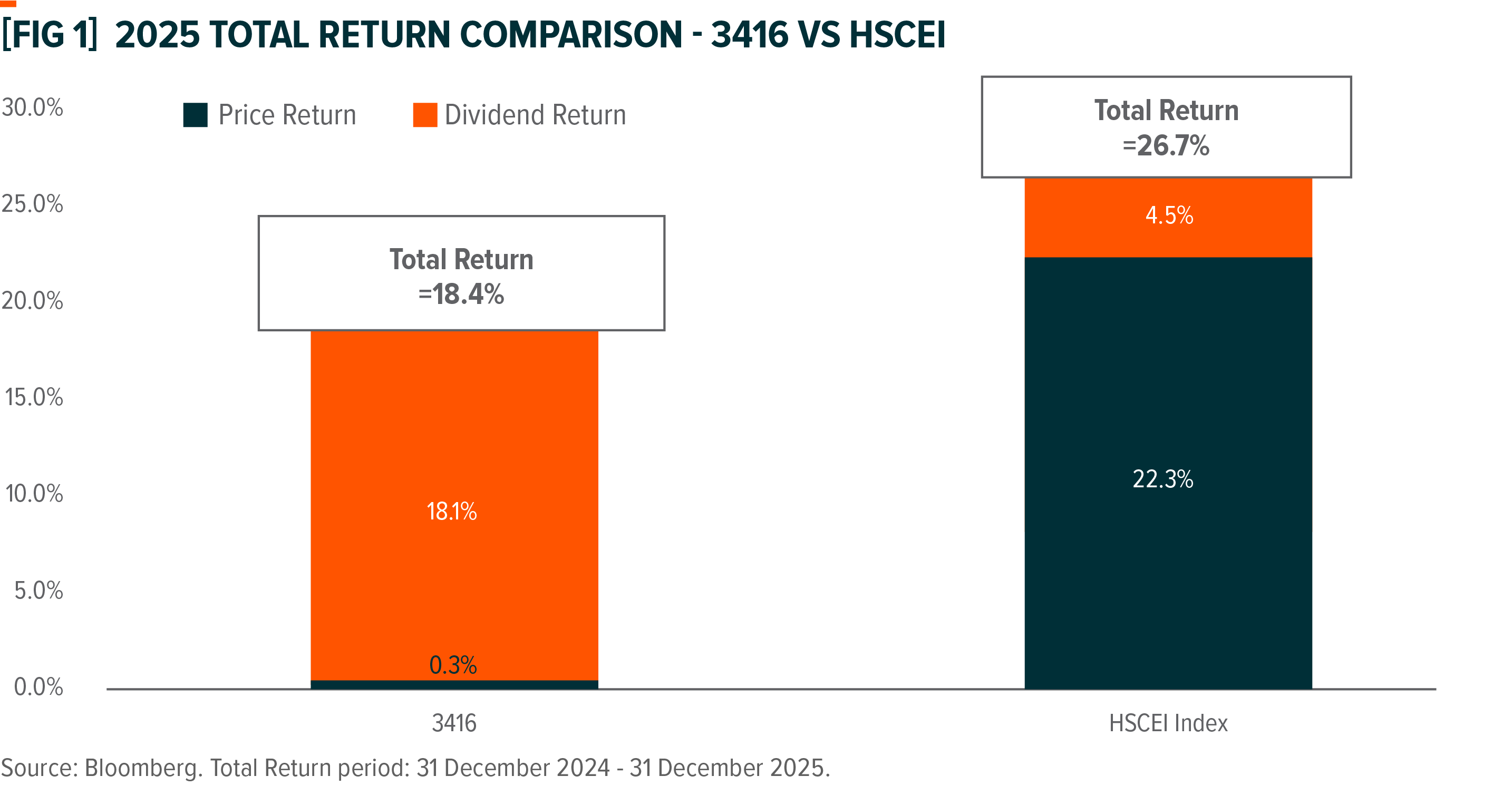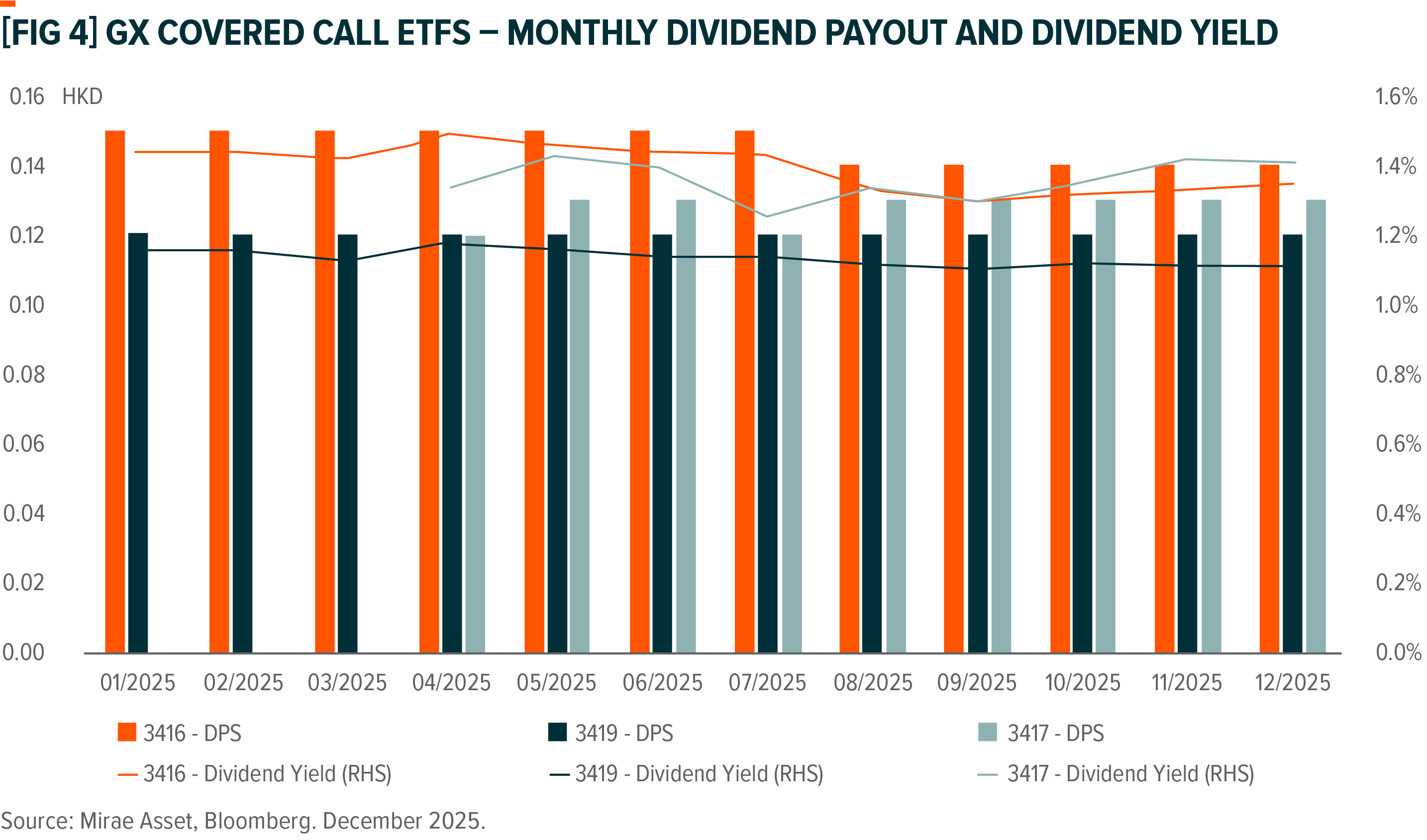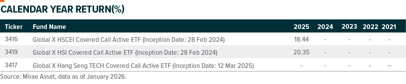 Global X HSCEI Covered Call Active ETF (3416) recorded 18.4% total return in 2025, with 18.1% dividend return and 0.3% price return. Global X HSI Covered Call Active ETF (3419) recorded 20.4% total return in 2025, with 15.3% dividend return and 5.1% price return. Despite the covered call strategy underperforming their underlying indices in a bullish Hong Kong market (with the HSI up by 33% in total return, marking the best performing year in the past 5 years), Global X Hong Kong Market Covered Call ETFs offer investors a comparatively stable monthly cash flow, and have shown superior downside protection during market drawdowns in both April and October. (Mirae Asset, January 2026)