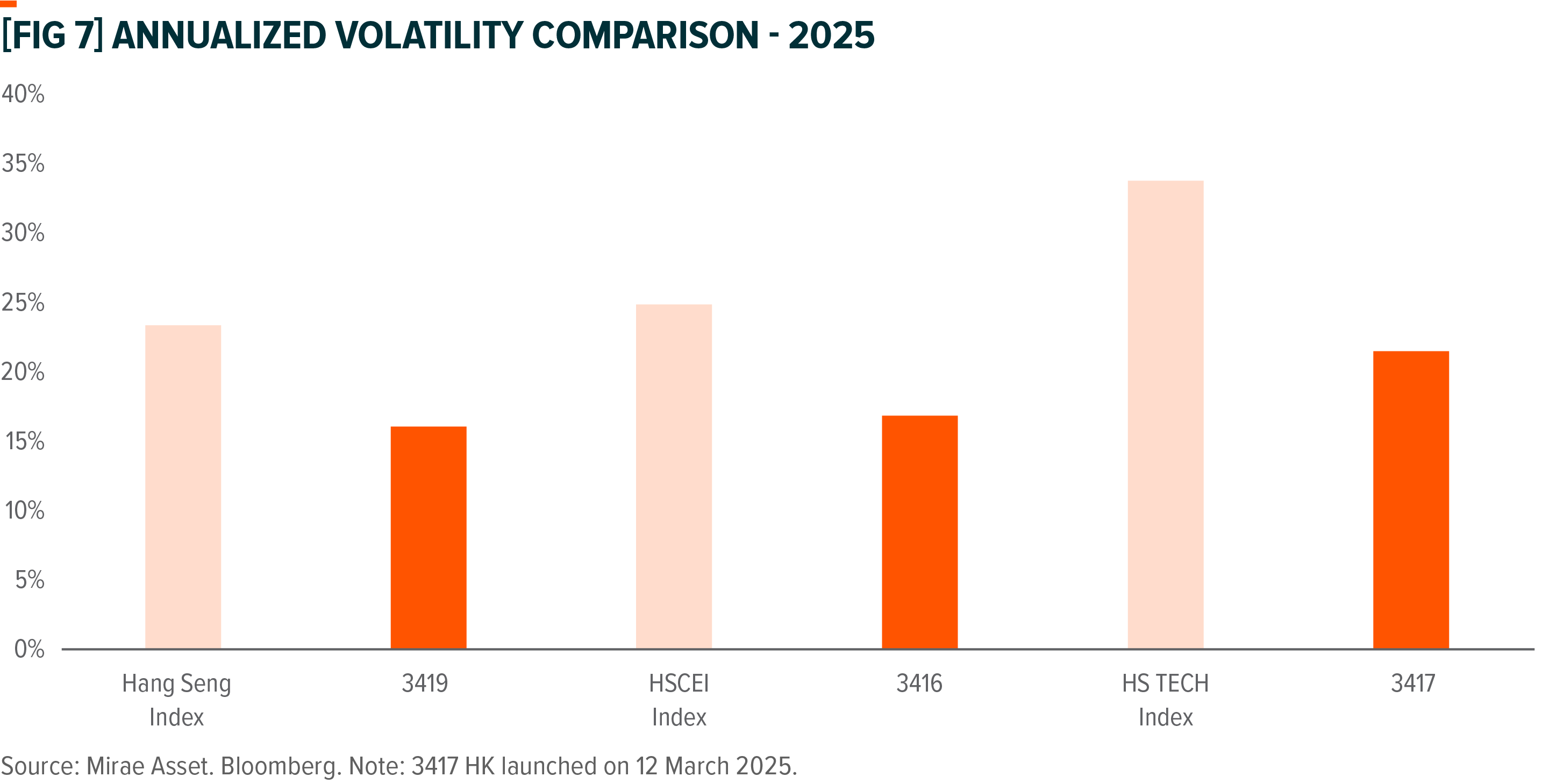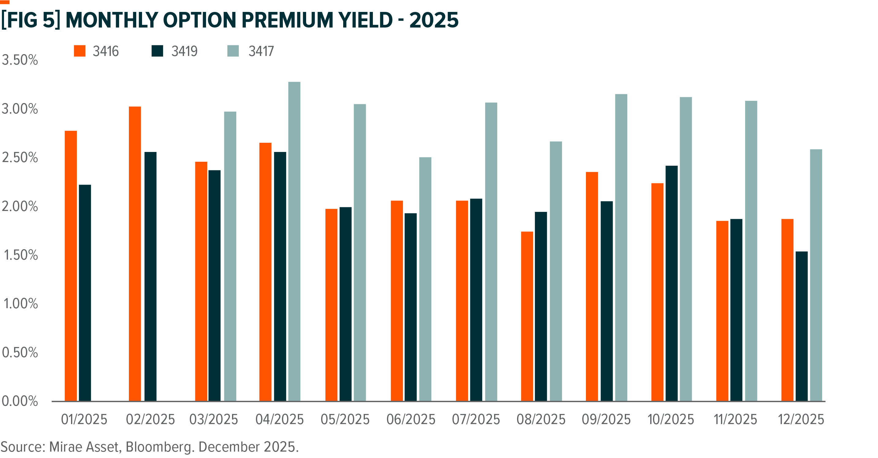 - Dividend Yield appears attractive after Hong Kong Market correction in 4Q. As of December 2025, monthly dividend yield is 1.35% for 3416 HK, 1.11% for 3419 HK, and 1.41% for 3417 HK. (Fig 4) (Source: Mirae Asset. Dividend Yield = dividend distributed / NAV at ex-div date)