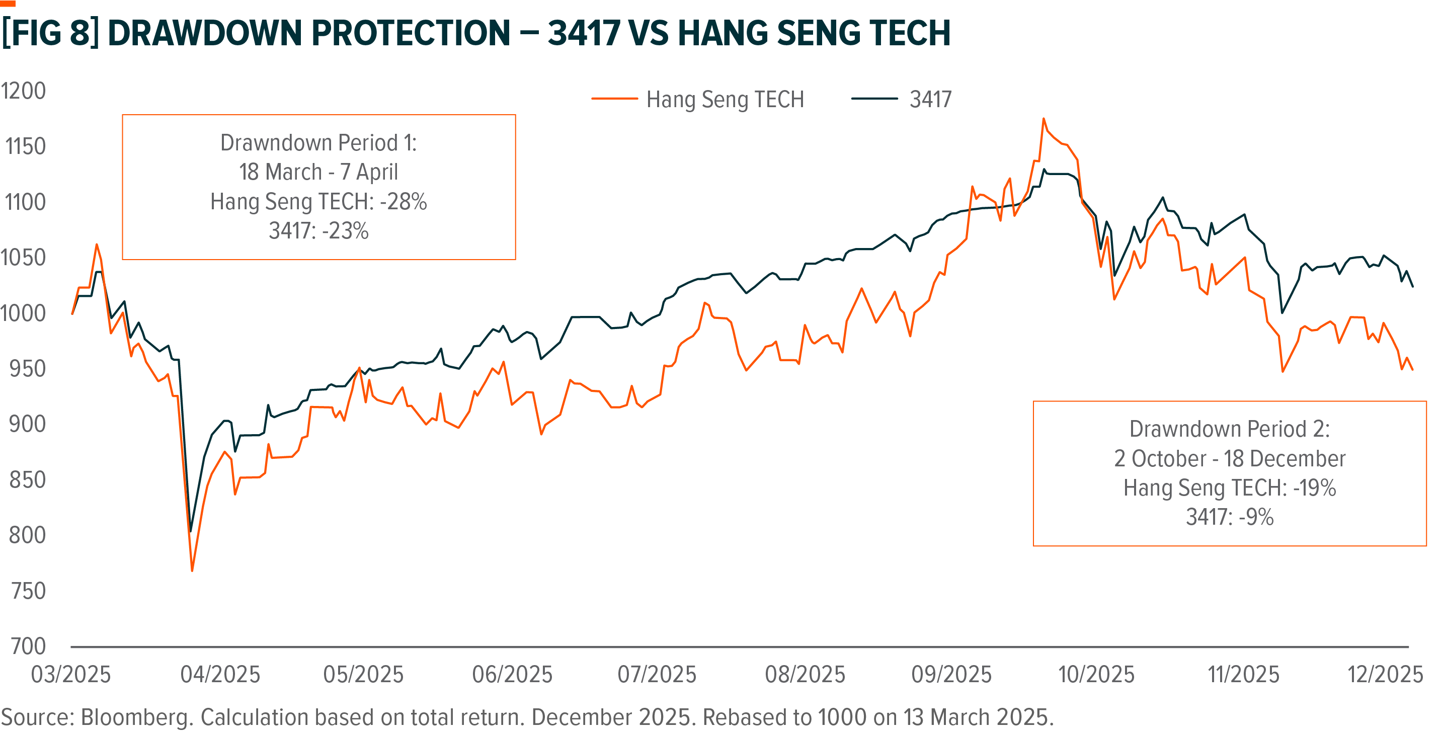 Despite underperforming the underlying indices in the 2025 Hong Kong bull market, the covered call strategy offers investors lower volatility, better drawdown protection, and a consistent source of stable cash flow. In the context of our analysis, we have observed decreased volatility in three GX Hong Kong Covered Call ETFs in comparison to their respective underlying indices (Fig 7). Additionally, the option premiums have provided significant downside protection during the two market corrections in April and October 2025 (Fig 8). While we maintain an optimistic outlook on an extended bull market in 2026, we acknowledge that the high volatility in the Hong Kong market is determined by the investor base and industry structure. The incorporation of covered call ETFs could bolster risk-adjusted returns for investor portfolios.
