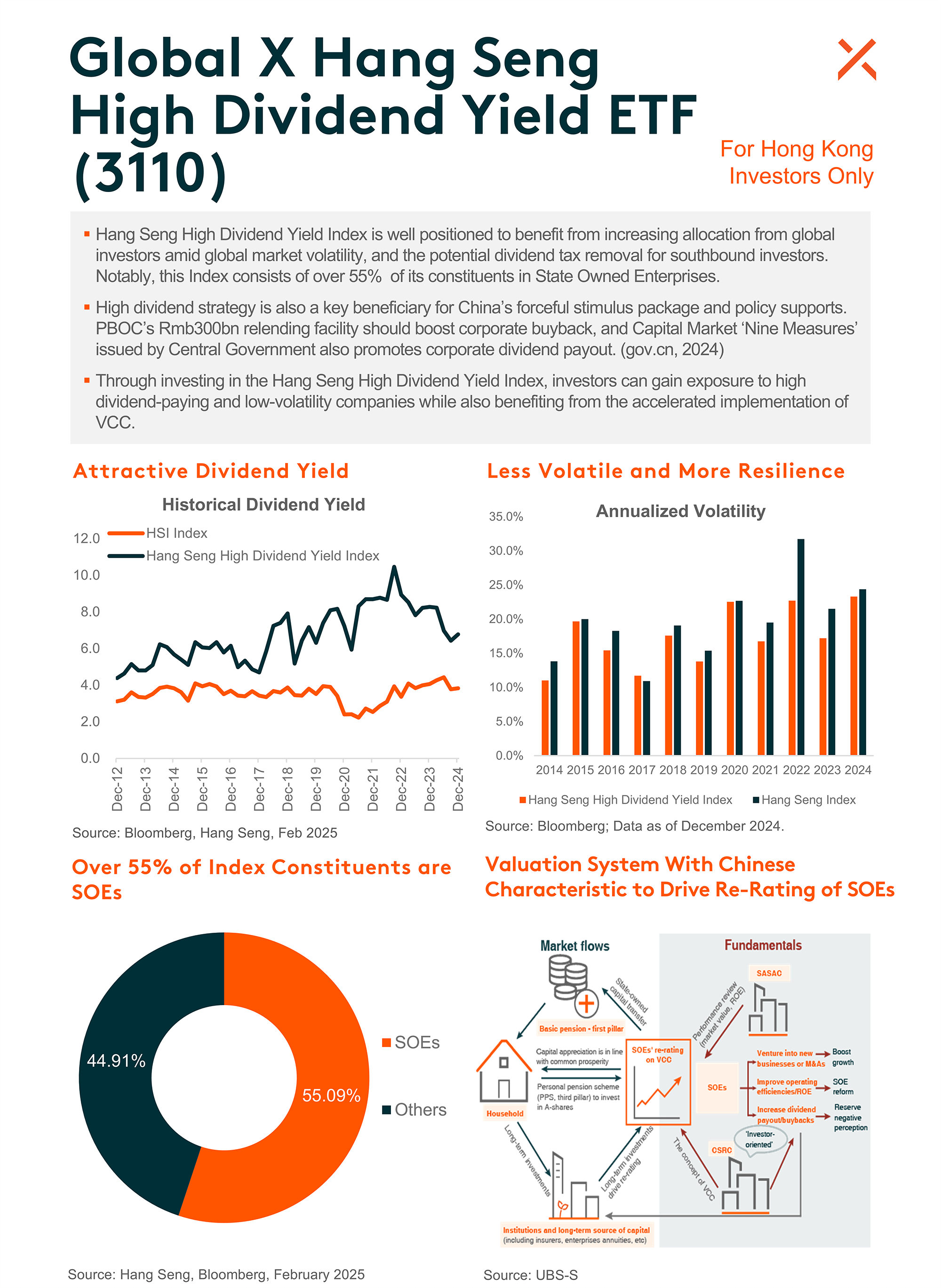 | Amid ongoing global trade uncertainty and the decreasing policy rates set by major central banks, the High Dividend Strategy continues to stand out for its combination of elevated dividend yields and reduced volatility. High dividend strategy is also a key beneficiary for China’s forceful stimulus package and policy supports. PBOC’s Relending facility should boost corporate buyback, and Capital Market ‘Nine Measures’ issued by Central Government also promotes corporate dividend payout. | ||||||||||||||||||||||