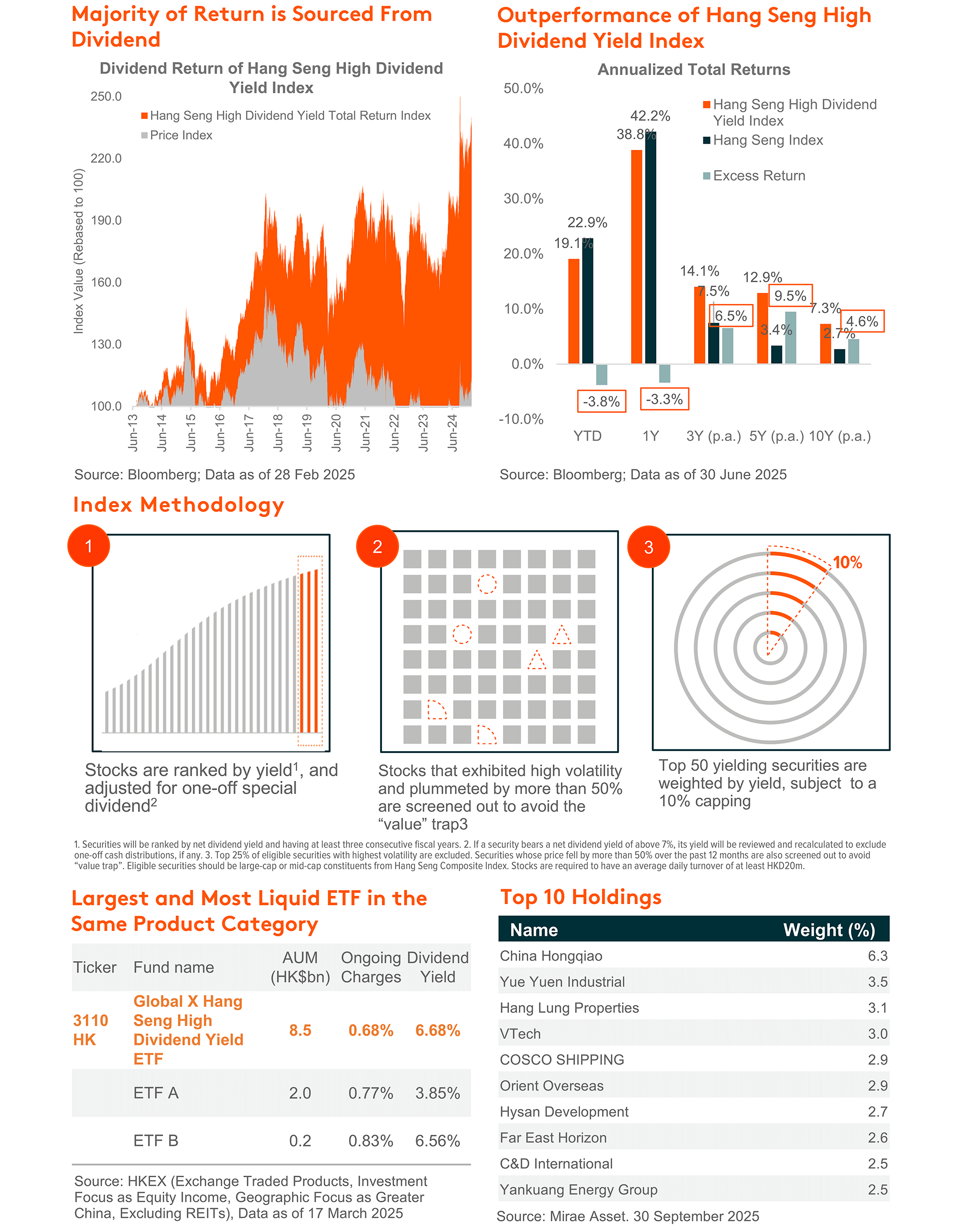 | Global X Hang Seng High Dividend Yield ETF (3110) | Reason for Inclusion: High dividend strategy has better resilient amid market volatility. The fund was up in October, vs -4% for Hang Seng Index. China market has seen style shift recently from growth to value/dividend, as more investors take profit amid market turbulence and towards year-end. This could continue in short term and drive 3110 outperformance. |