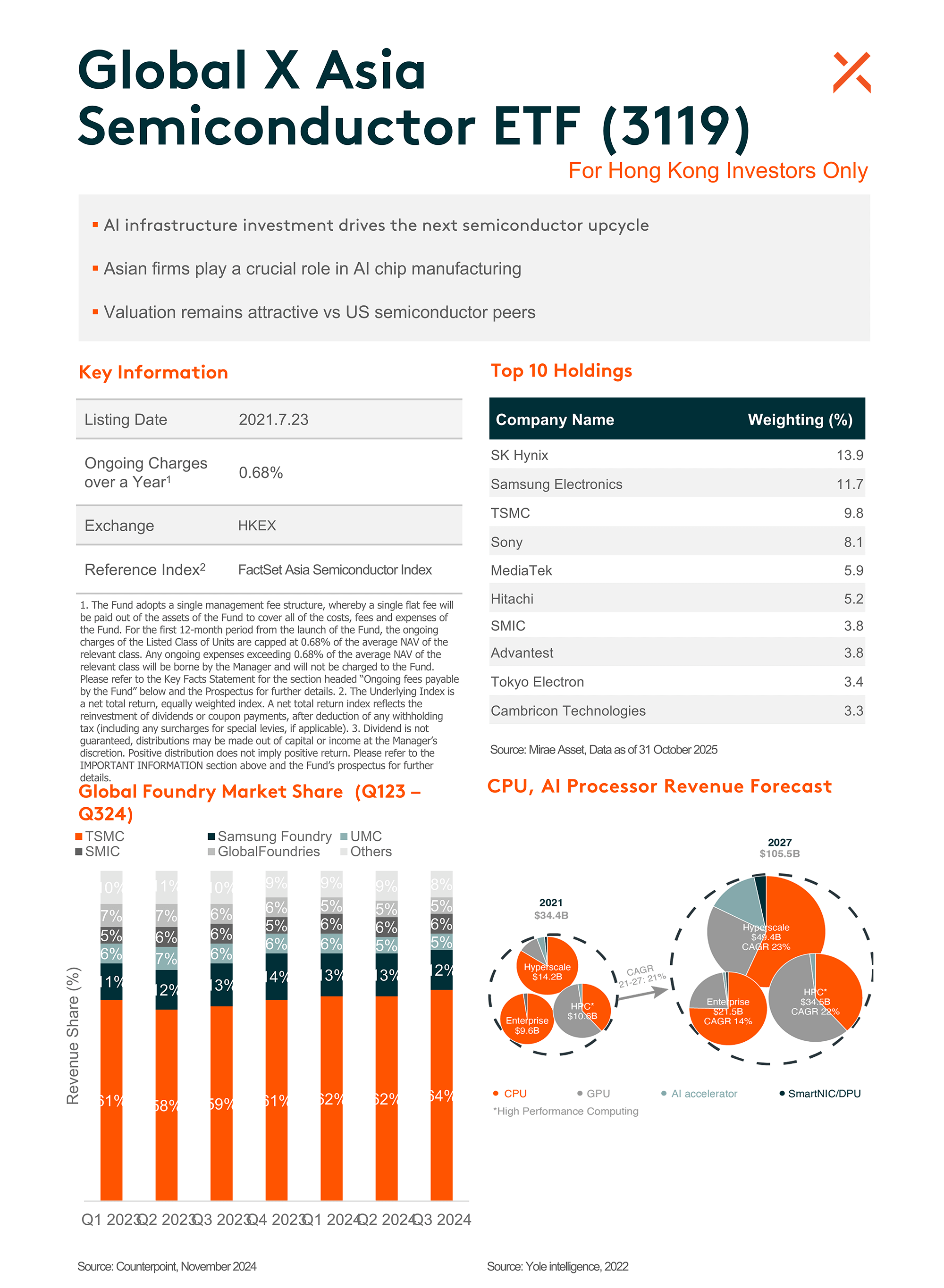 | Asia Semiconductor ETF (3119) | Reason for Inclusion: Asia has established itself as the undisputed center of the global semiconductor ecosystem, particularly for AI enabler. The AI boom is driving massive investments in hardware, where Asia demonstrates a marked edge. |