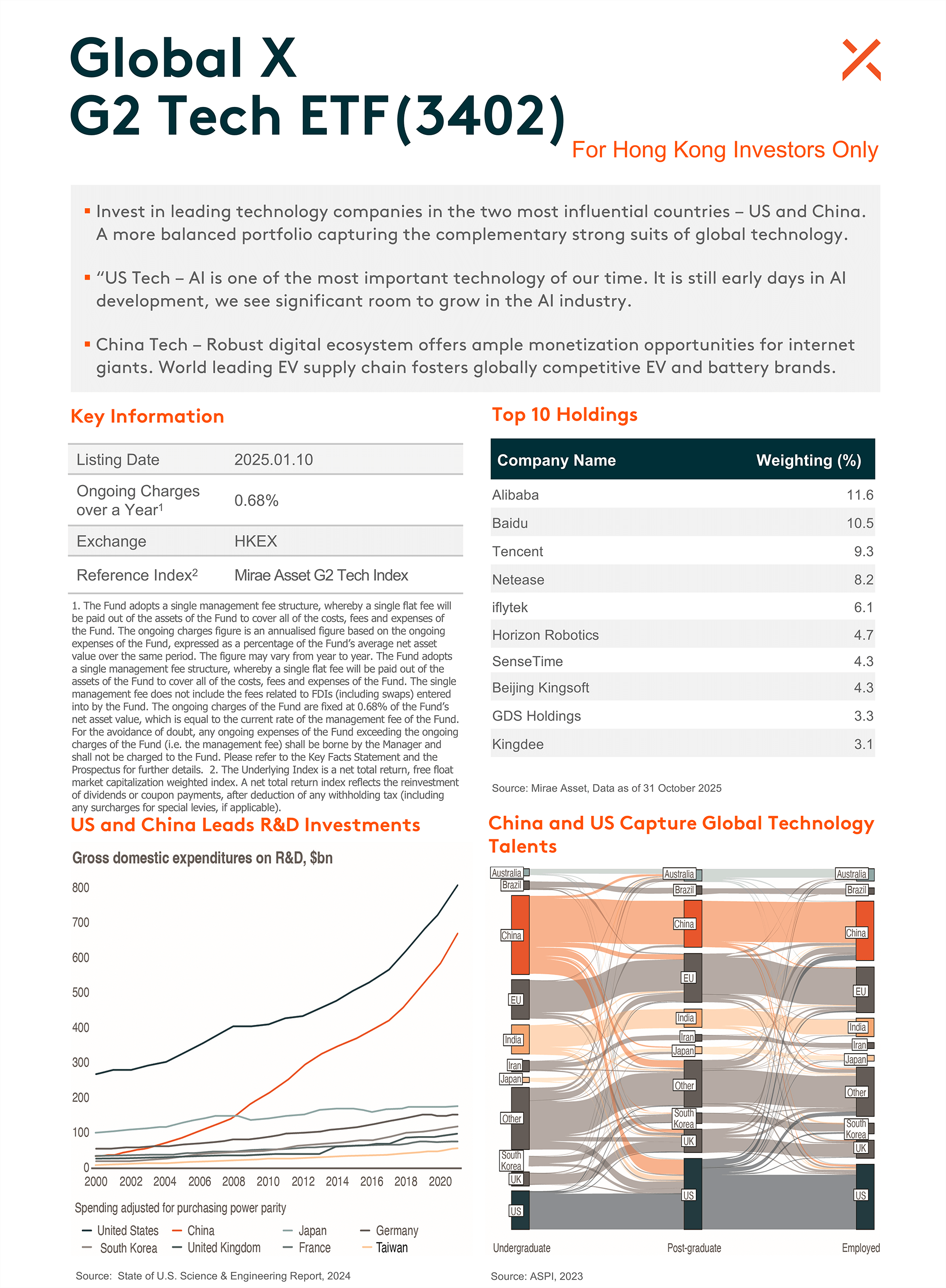 | The ETF invests in US and China technology leaders, offering a more balanced portfolio to capture the complementary strong suits of US and China technology. The recent development in China technology across AI, humanoid robot, and smart driving is regaining global investors’ attention on the innovation capability of Chinese companies, and could drive a more sustainable rerating on Chinese technology stocks. For US, the substantial investments into AI continues and tech giants are poised to benefit from AI development and adoptions. | ||||||||||||||||||||||