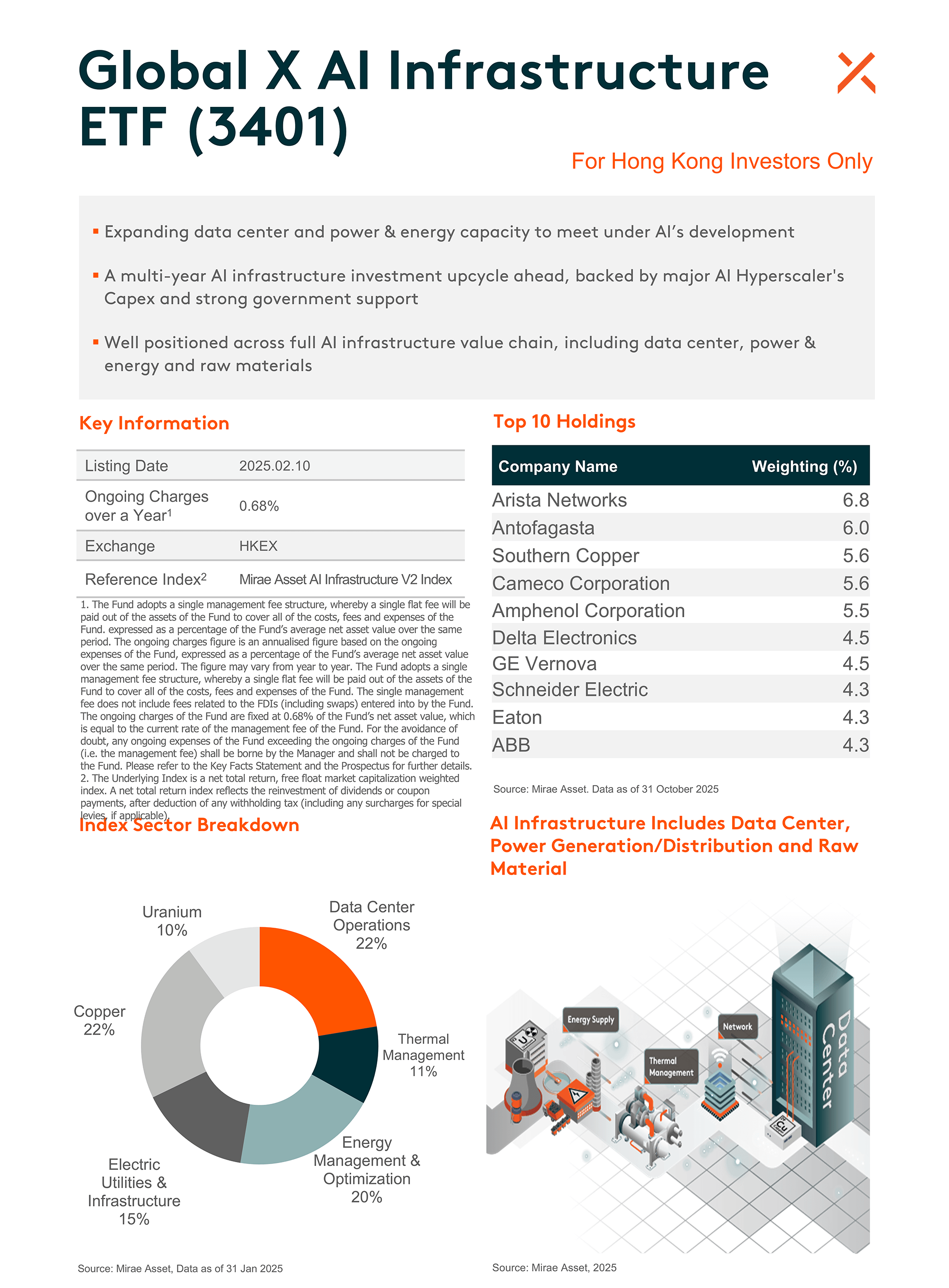 - The investment objective of Global X AI Infrastructure ETF (the “Fund”) is to provide investment results that, before fees and expenses, closely correspond to the performance of the Mirae Asset AI Infrastructure V2 Index.