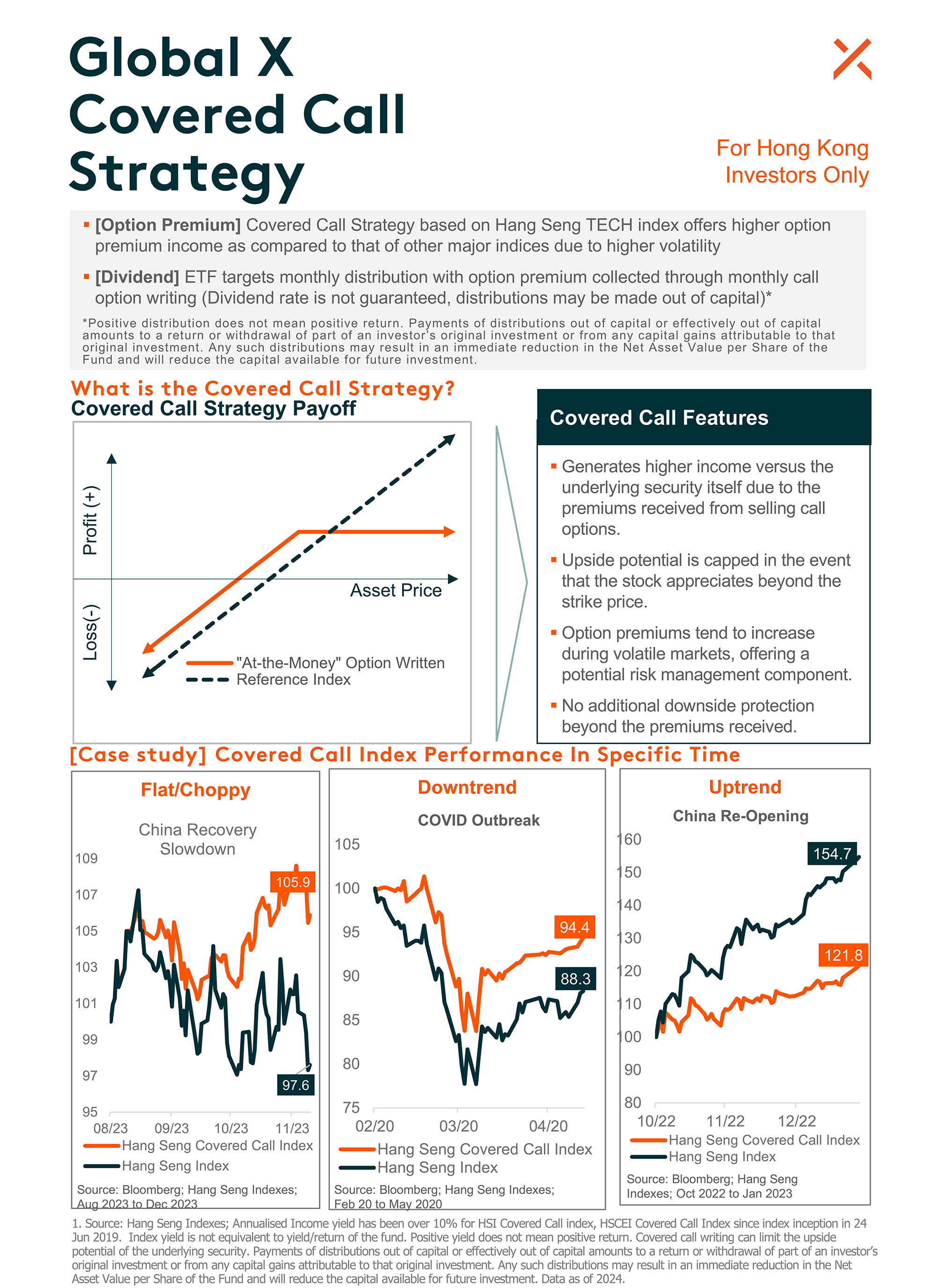 - The investment objective of Global X Hang Seng TECH Covered Call Active ETF (the “Funds”) is to generate income by primarily investing in constituent equity securities in the Hang Seng TECH Index (the “Reference Index”) and selling (i.e. “writing”) call options on the Reference Indexes respectively to receive payments of money from the purchaser of call options (i.e. “premium”).