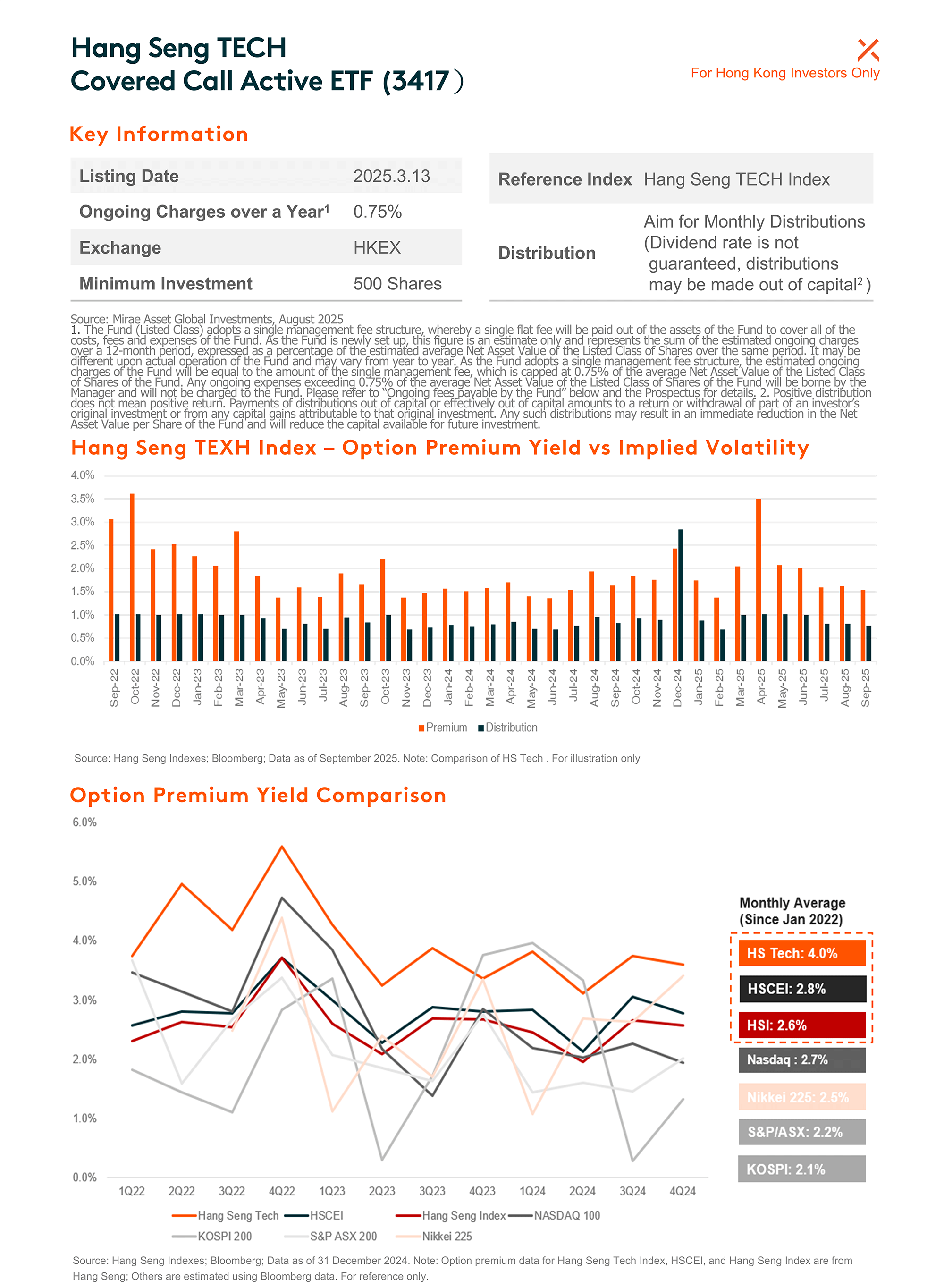 | Hang Seng TECH Covered Call ETF (3417) | Reason for Inclusion: Hang Seng TECH Index continued correction in October. Despite near-term volatility, longer term drivers for Hang Seng TECH remains intact with the rapid development of China’s core technology segments including AI, Semi, and EV. 3417 offers exposure to leading tech companies, and help investors to capitalize on volatility through option strategy. |