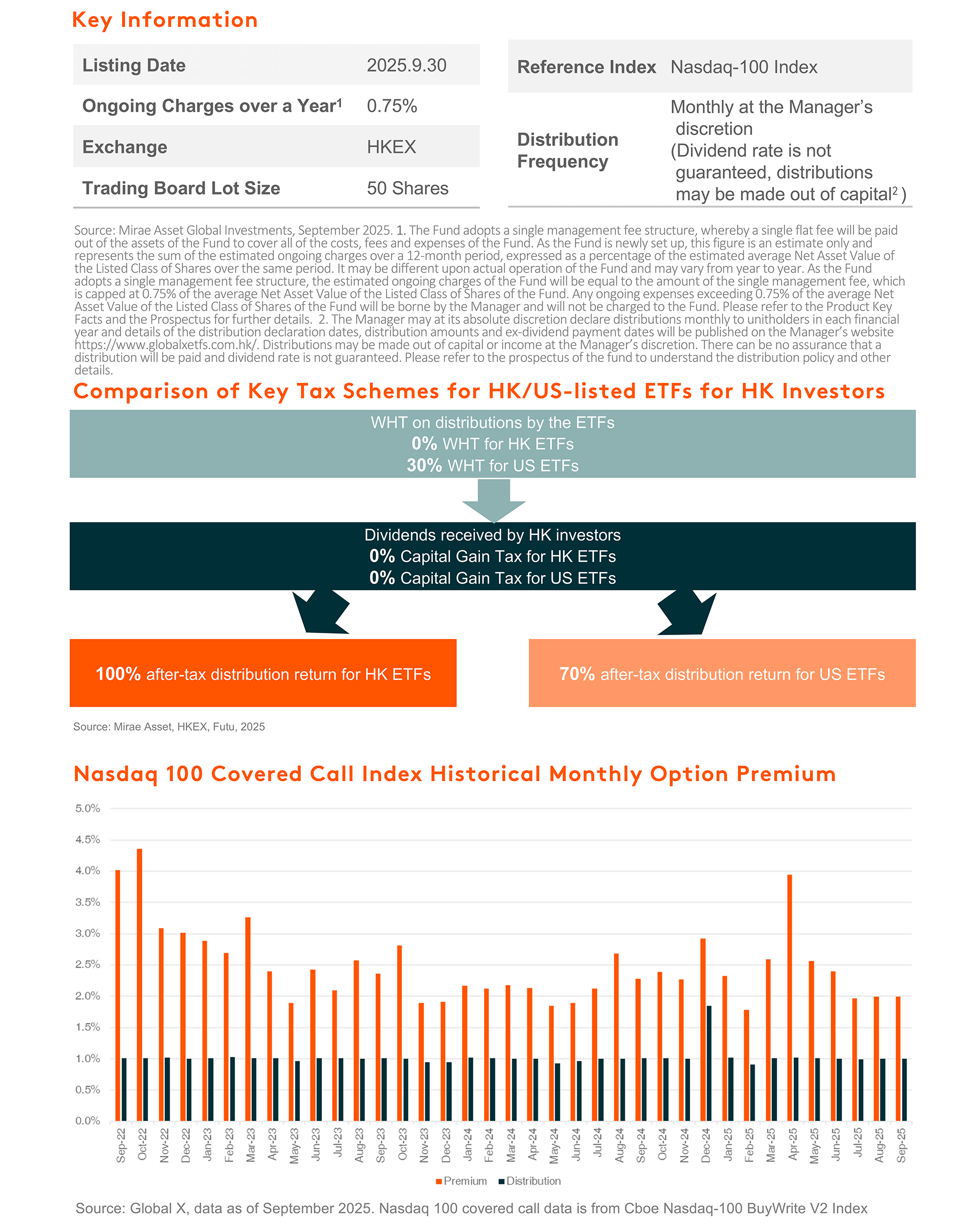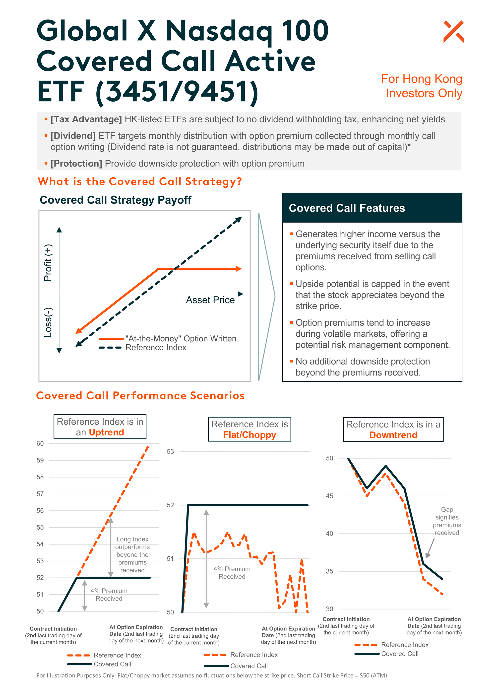 | 3451 combines Nasdaq 100 exposure with an active covered call strategy, aiming to provide premium income potential, downside cushioning, and tax efficiency for Hong Kong investors. (Aims at Monthly Distribution. Dividend rate is not guaranteed, distributions may be made out of capital 1).