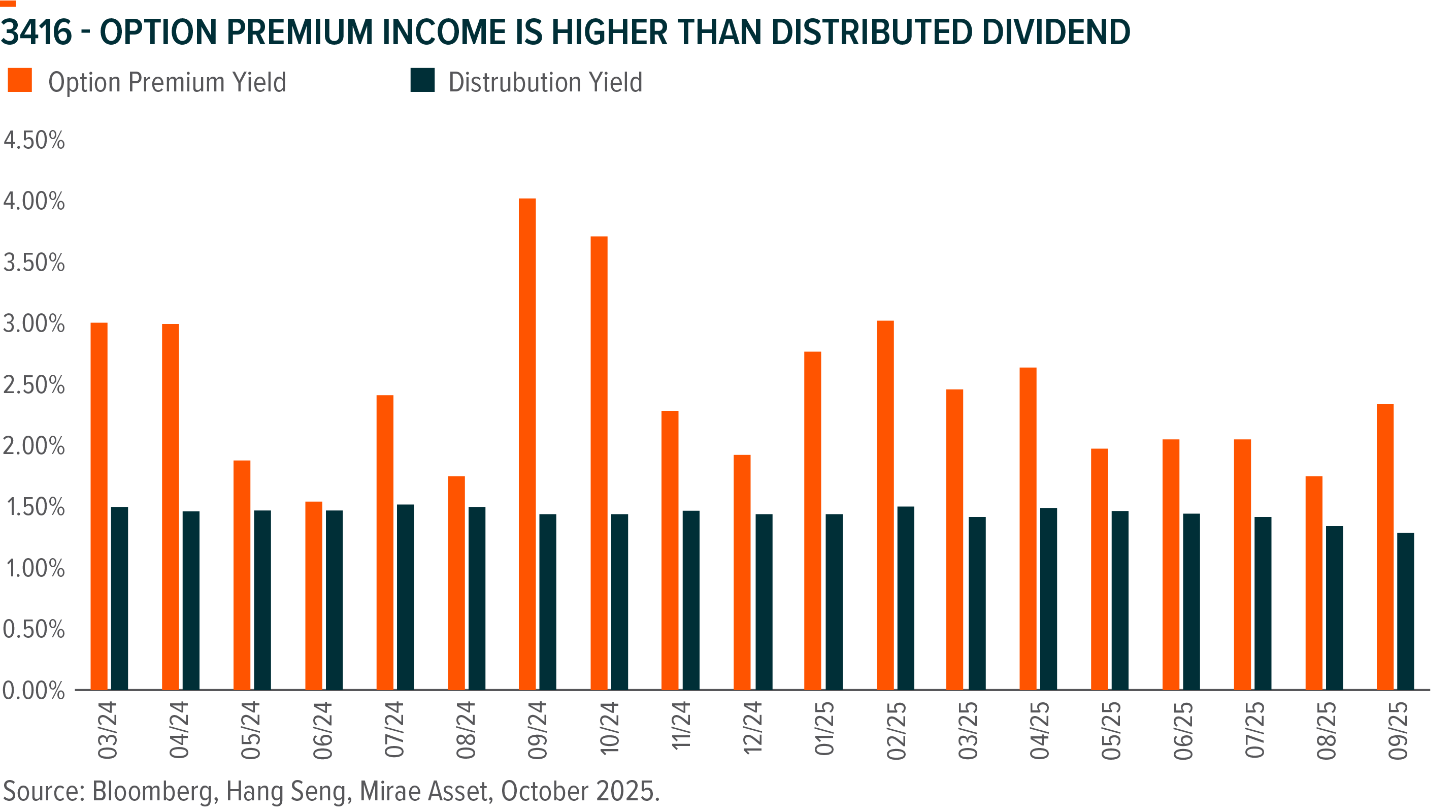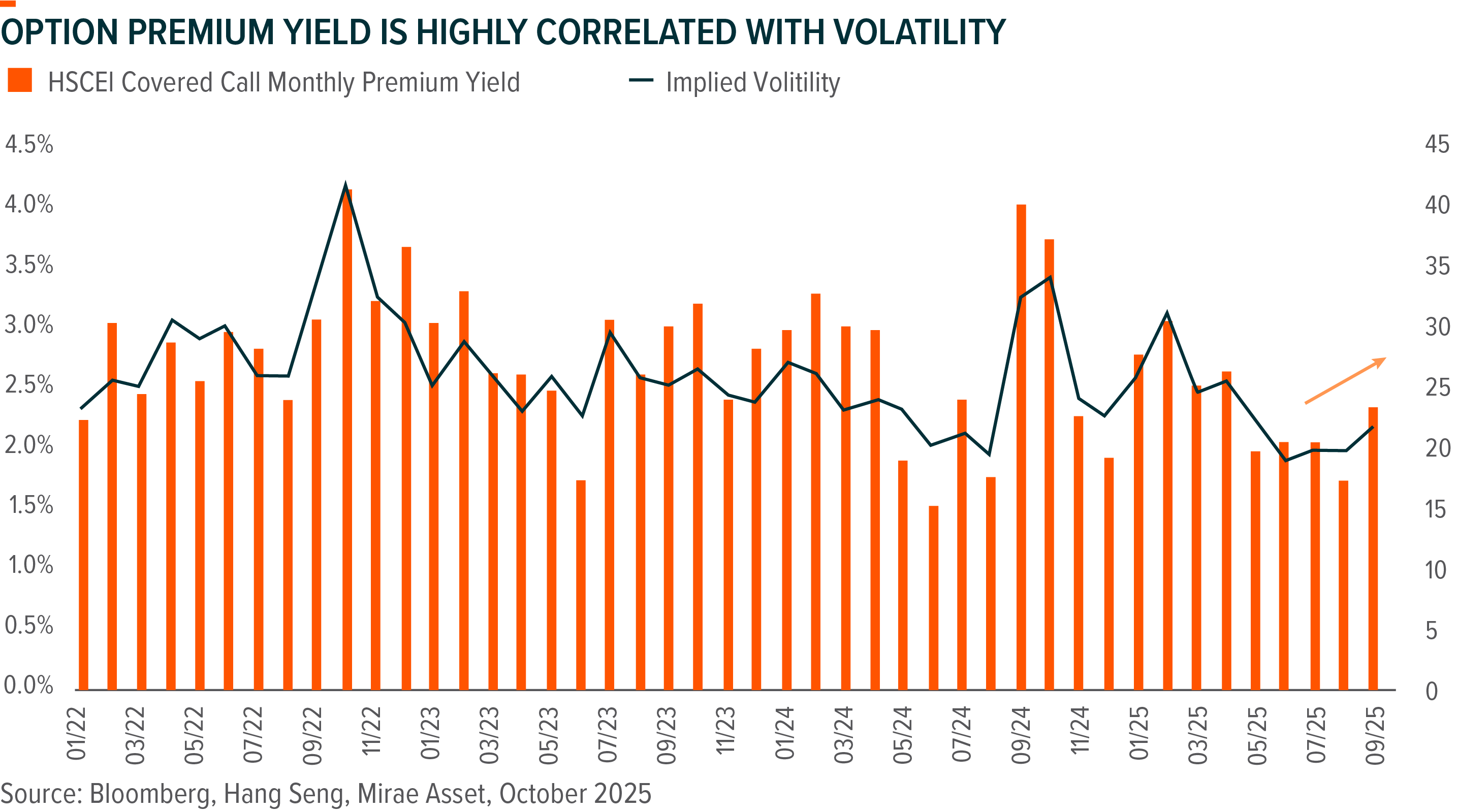 Major source of income for Covered Call Strategy is option premium from selling call options. Option premium tends to increase in tandem with market volatility, making range-bound market a favourable market condition for Covered Call Strategy. Following the China market rally that ensued after the last round of US tariff threats in April, Hong Kong market volatility edged up in September, leading to higher option premiums. The uncertainty surrounding the latest round of tariff escalation at this stage may contribute to a sustained rise in market volatility, resulting in elevated option premiums for the Covered Call Strategy.