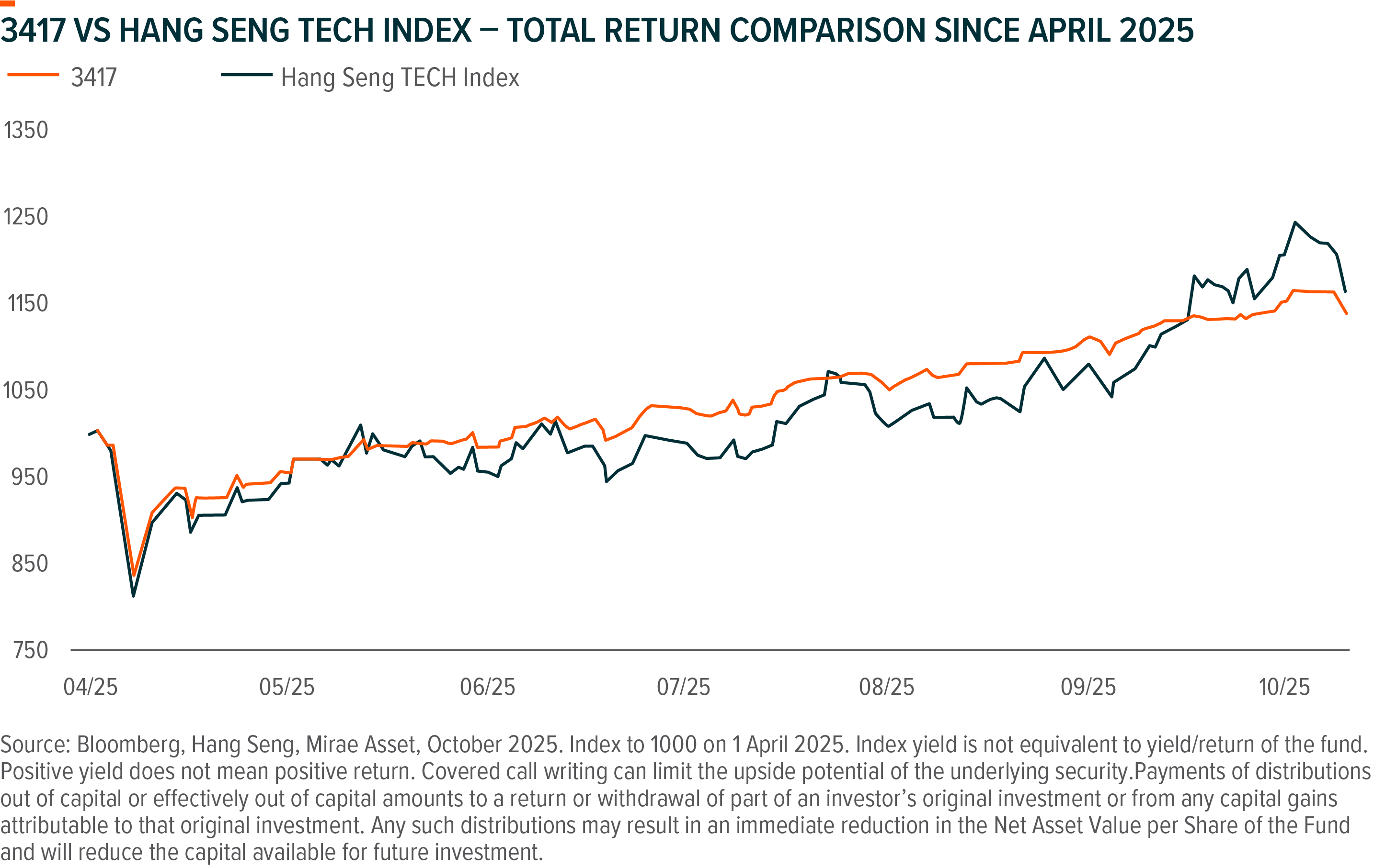 As the underlying index declines, the Covered Call Strategy also experiences a decrease, albeit to a lesser degree due to the partial protection offered by the option premium. In the last round of tariff negotiation in April, Global X Hang Seng TECH Covered Call ETF (3417) demonstrated resilience — experiencing a milder adjustment than the Hang Seng TECH Index and later recovering as market sentiment improved. As Global X Covered Call ETFs target to pay monthly dividend (Aim to Monthly Distribution. Dividend rate is not guaranteed, distributions may be made out of capital#) through selling monthly call option, the near-term correction could offer a favorable buying opportunity for these ETFs, potentially resulting in a higher monthly dividend yield.
