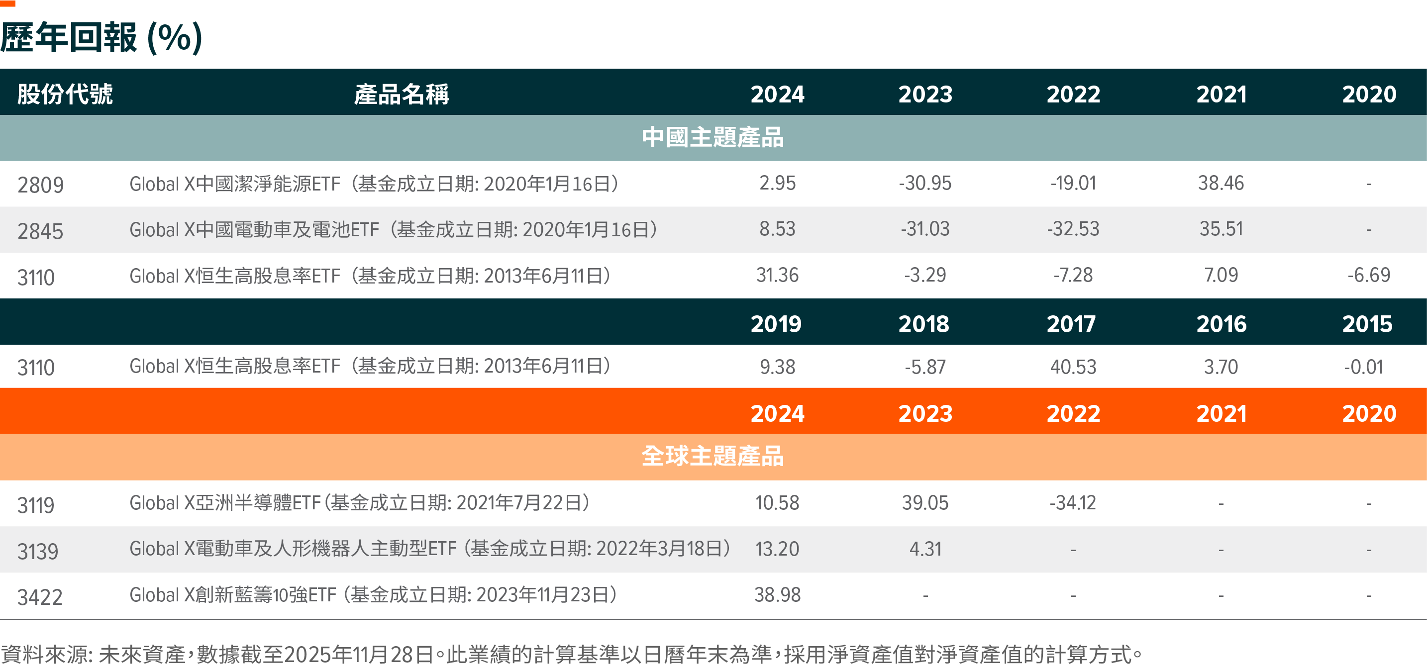 • Global X亞洲半導體ETF (「本基金」於股票證券的投資須承受一般市場風險,其價值可能因投資氣氛、政治、地緣政治及經濟狀況變動以及發行人特定因素等多種因素而波動。