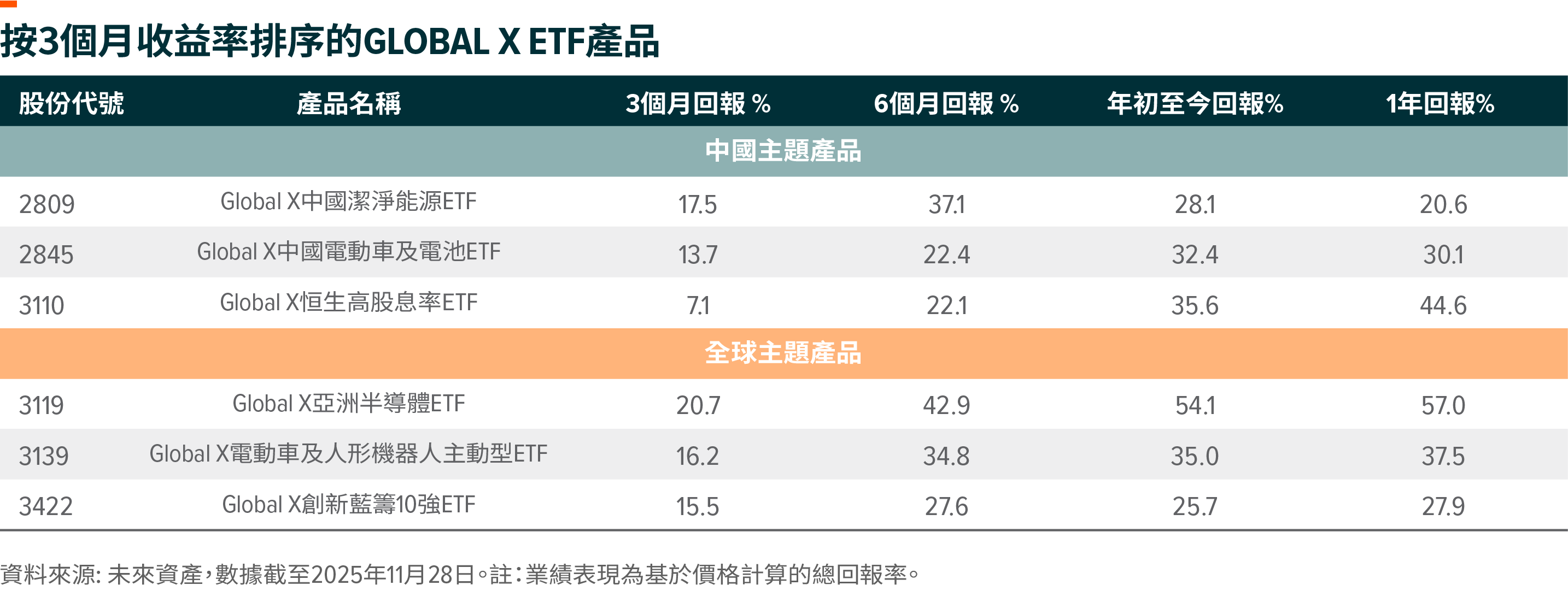 本文重點整理了Global X ETF中過去三個月表現最突出的產品。截至11月底,在中國主題性產品中,Global X 中國潔淨能源 ETF(2809)Global X 中國電動車及電池 ETF(2845)Global X 恒生高股息率 ETF(3110)領跑市場;全球主題性產品中,Global X 亞洲半導體ETF(3119)領先市場;在全球主題性產品中,Global X 亞洲半導體ETF(3119)Global X 90313F)創新藍籌10強ETF(3422)表現突出,下文將深入剖析推動其近期成長的核心驅動力。