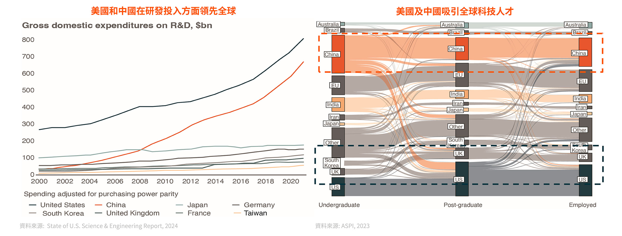- 中美兩國在高端科技領域的領先地位,其共同特徵在於研發投入巨大且人才儲備雄厚。