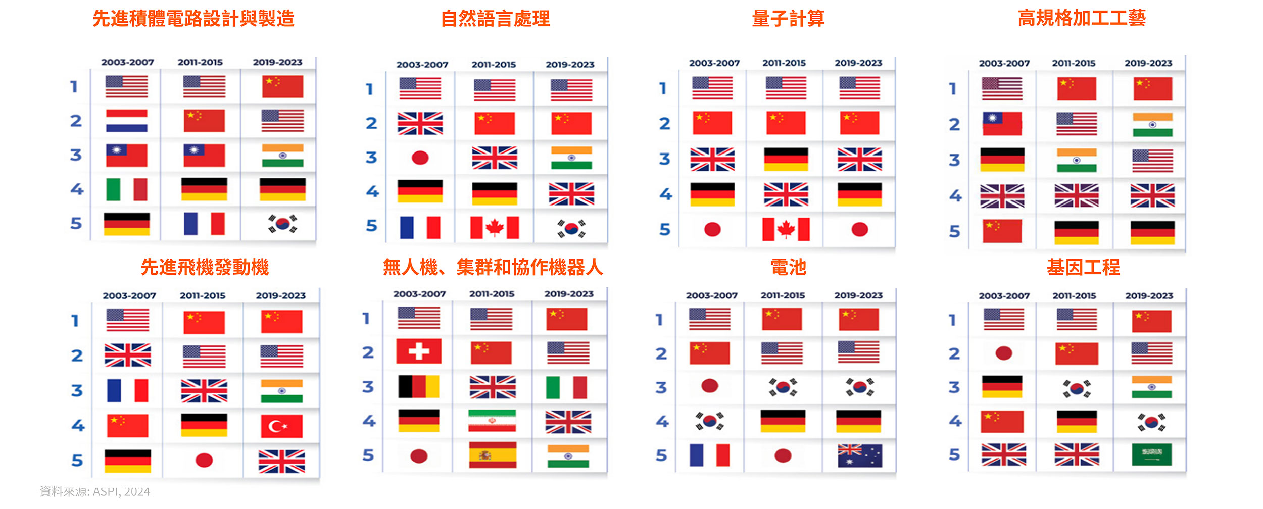 - 美國和中國在幾乎所有關鍵技術領域的高影響學術發表方面名列前茅