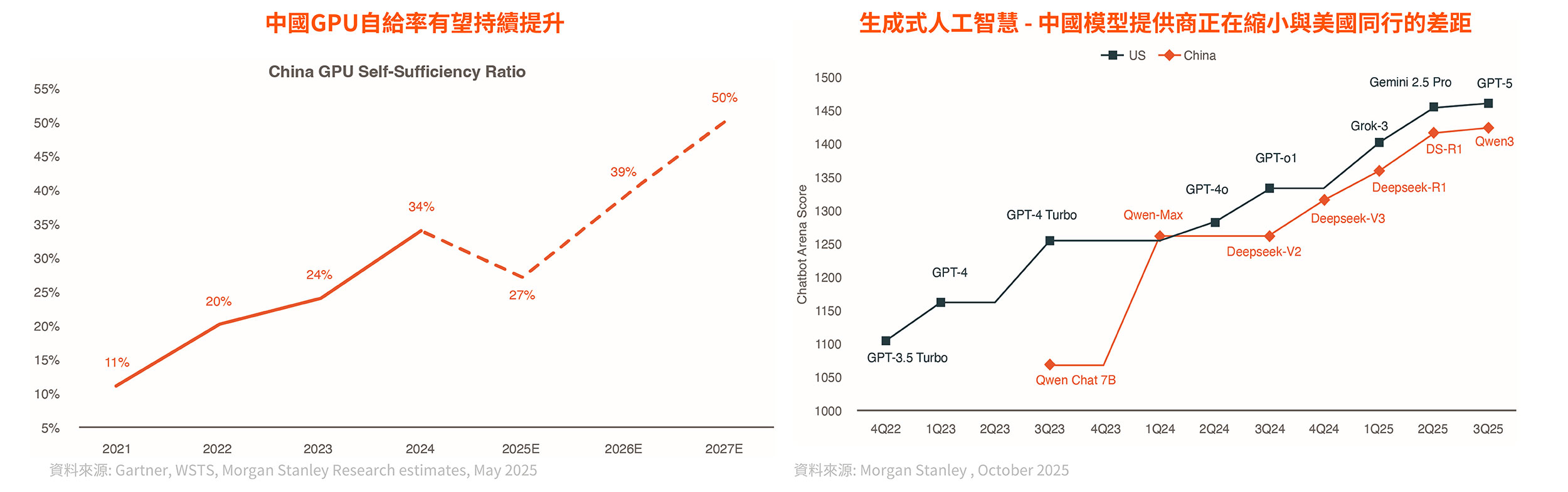 - 中國在這方面正在取得進展。持續的美國晶片禁令和強勁的中國人工智慧需求推動了自給率的上升。此外,中國在稀土領域的主導地位也為其帶來了強大的對美國的議價能力。