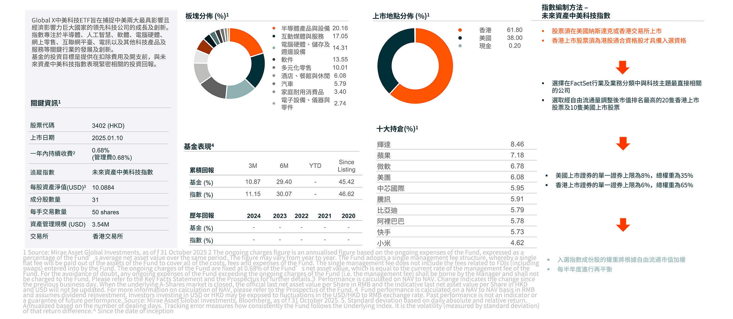 - Global X中美科技ETF(「本基金」) 的投資目標是提供在扣除費用及開支前,與未來資產中美科技指數(「指數」)表現緊密相關的投資回報。