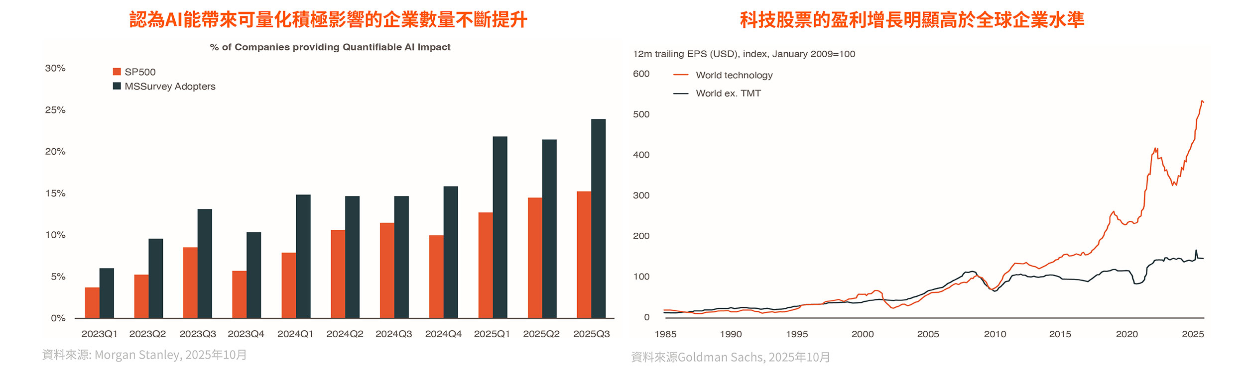 - 儘管估值高企,但我們觀察到人工智慧積極地帶來生產力提升,這讓我們相信人工智慧可能並非處於泡沫之中,至少在目前階段。