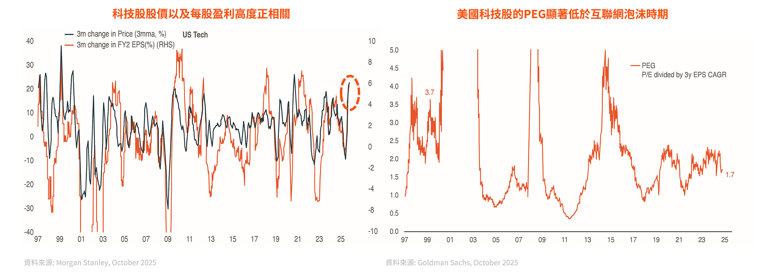 - 從盈利增長(PEG指數)來看,在歷史背景下,科技股票的估值處於合理範圍內。