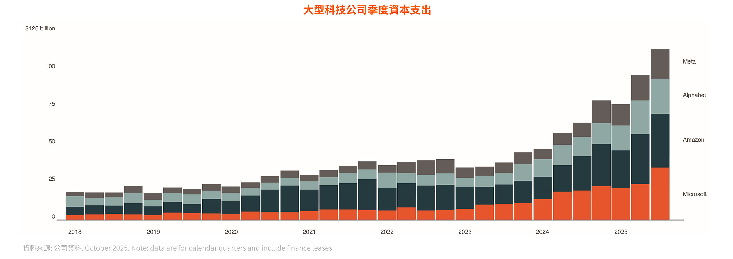 - AI支出趨勢強勁:由於人工智慧基礎設施需求持續超過供給,四大超大規模雲服務提供者在2025年第三季度的AI資本支出已超過1000億美元。