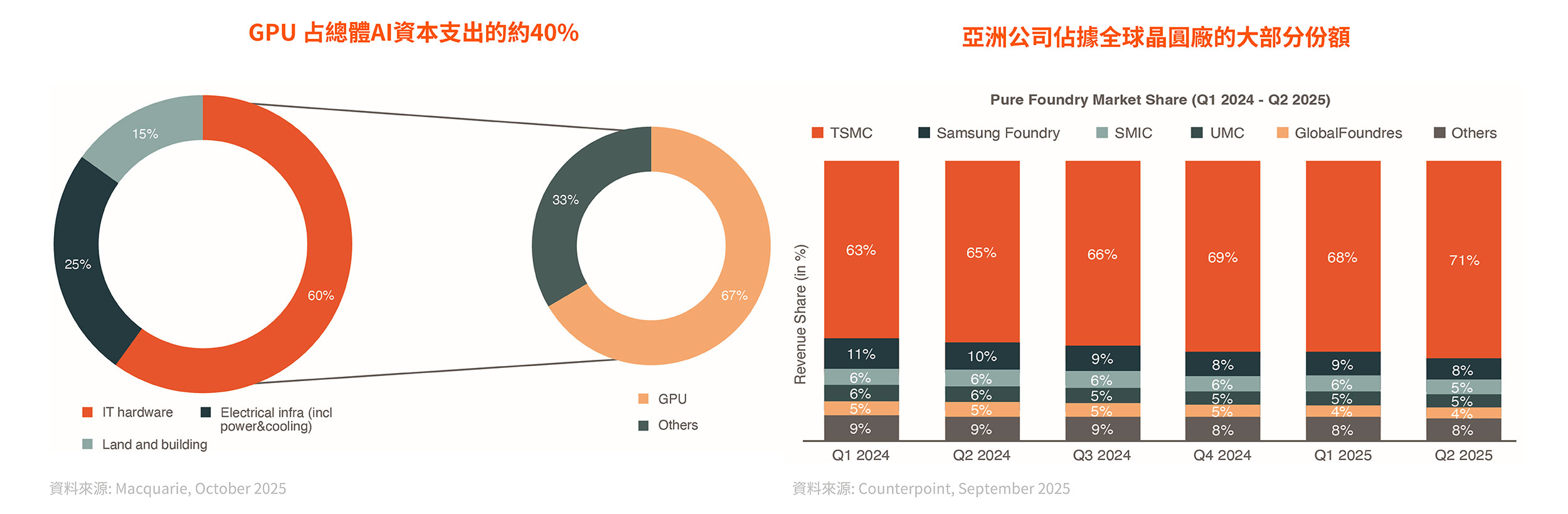 - 亞洲已經確立了全球半導體生態系統的重要地位,特別是在人工智慧熱潮下。人工智慧熱潮推動著硬體領域的大規模投資,亞洲企業顯著受益。