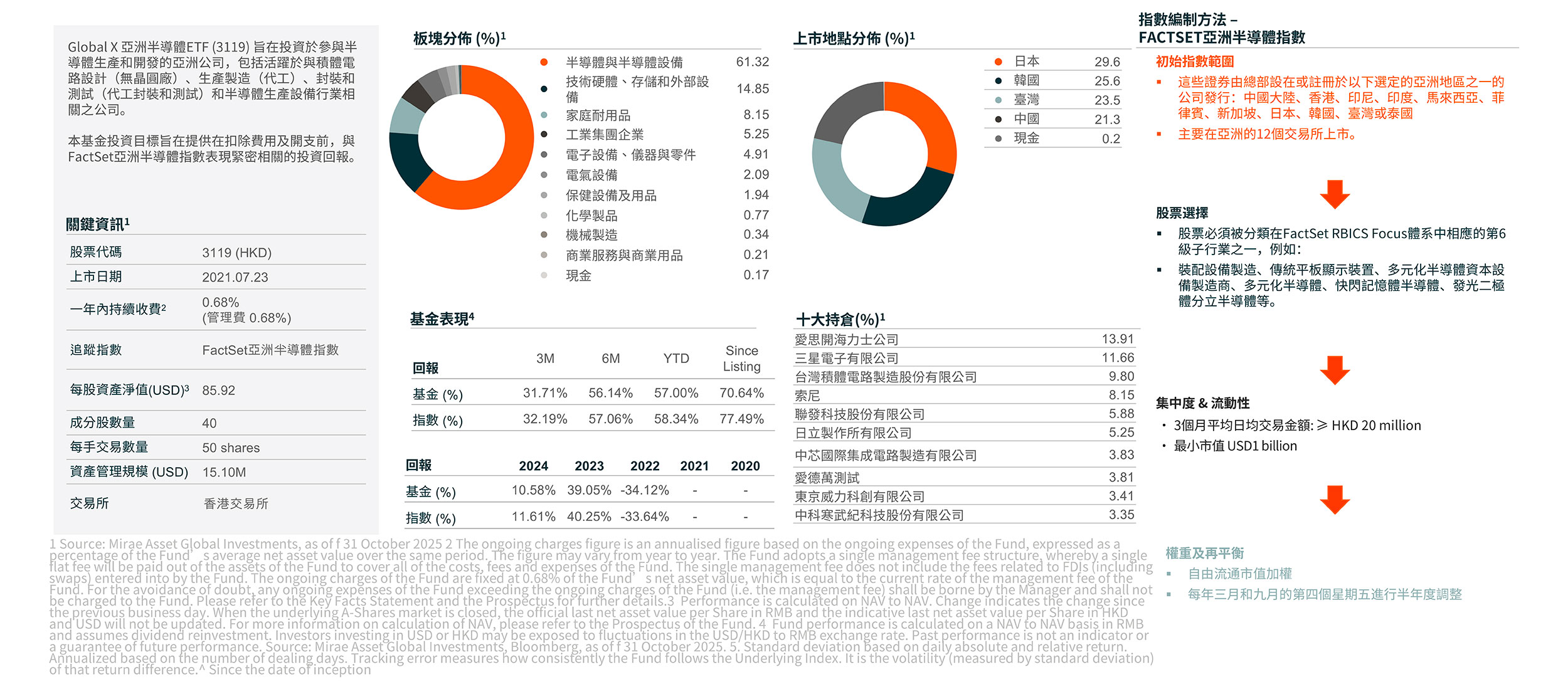 - Global X亞洲半導體ETF (「本基金」) 於股票證券的投資須承受一般市場風險,其價值可能因投資氣氛、政治、地緣政治及經濟狀況變動以及發行人特定因素等多種因素而波動。