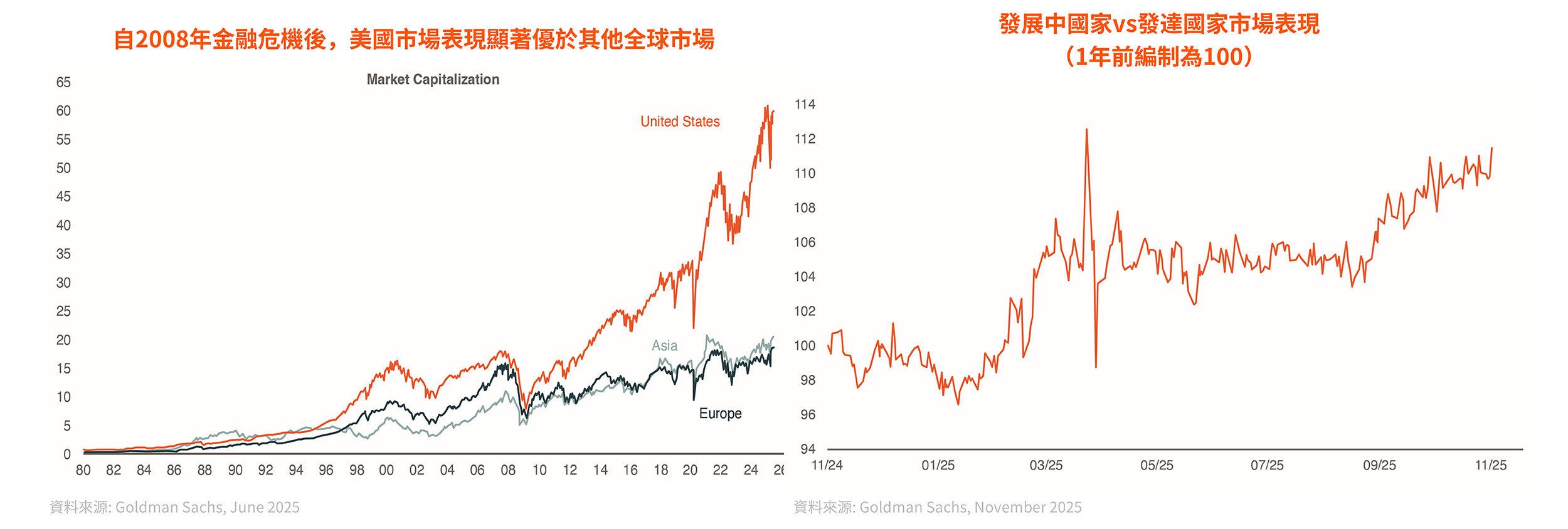 - 自2025年初以來,非美經濟體的韌性表現,加上美國不斷擴大的財政赤字和政策不確定性的增加,共同抬升了美元的風險溢價。這導致美元貶值,對於以美元為基礎的投資者而言,非美股票變得更具吸引力,從而成為驅動資金進行多元化配置的另一個因素。