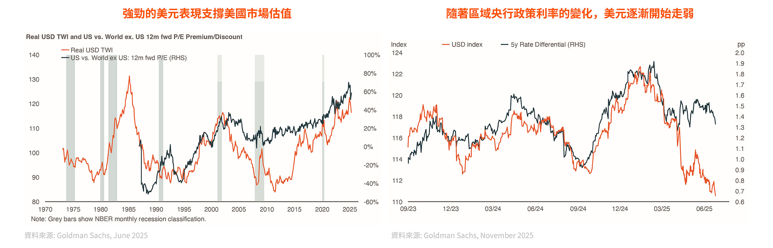 - 另一方面,市場估值和集中度已處於歷史高位,且作為美國市場順風因素的美元正顯現走弱跡象。