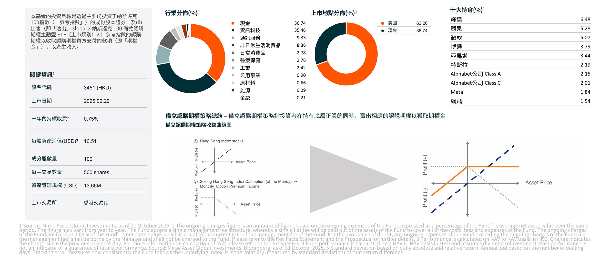 - Global X 納斯達克100備兌認購期權主動型ETF(「本基金」)的投資目標是透過主要(i)投資於納斯達克100指數(「參考指數」)的成份股本證券;及(ii)出售(即「沽出」)參考指數的認購期權以收取認購期權買方支付的款項(即「期權金」),以產生收入。