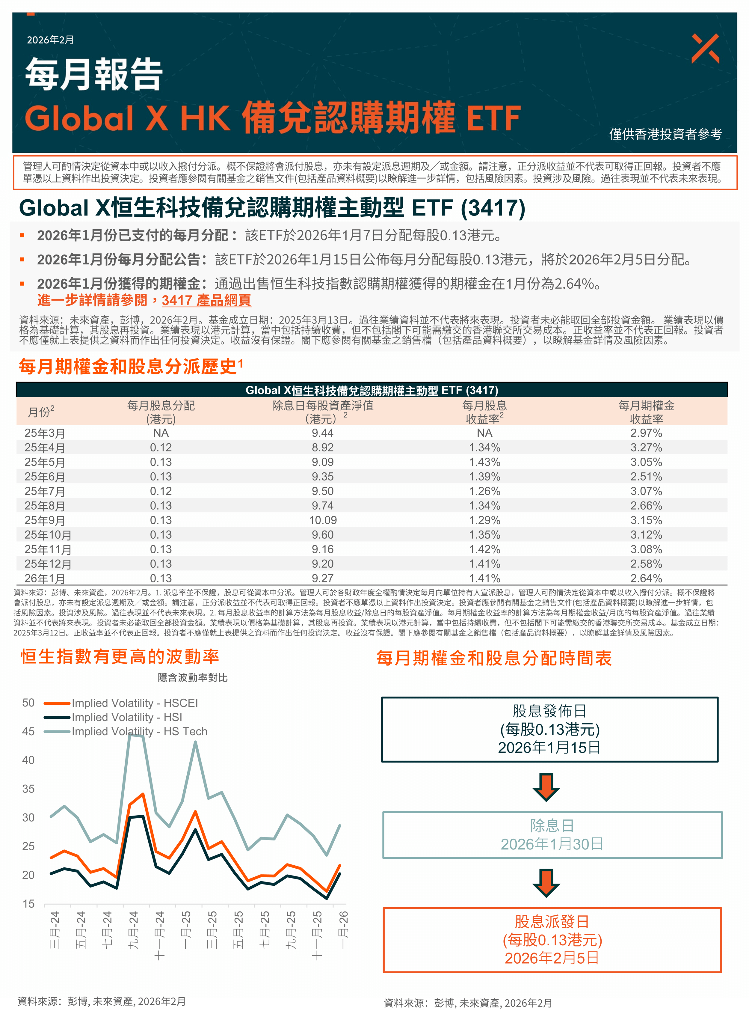- Global X 恒生科技備兌認購期權主動型ETF(「本基金」)的投資目標是透過主要(i)投資於恒生科技指數(「參考指數」或「恒生科技指數」)的成份股本證券;及(ii)出售(即「沽出」)參考指數的認購期權以收取認購期權買方支付的款項(即「期權金」),以產生收入。