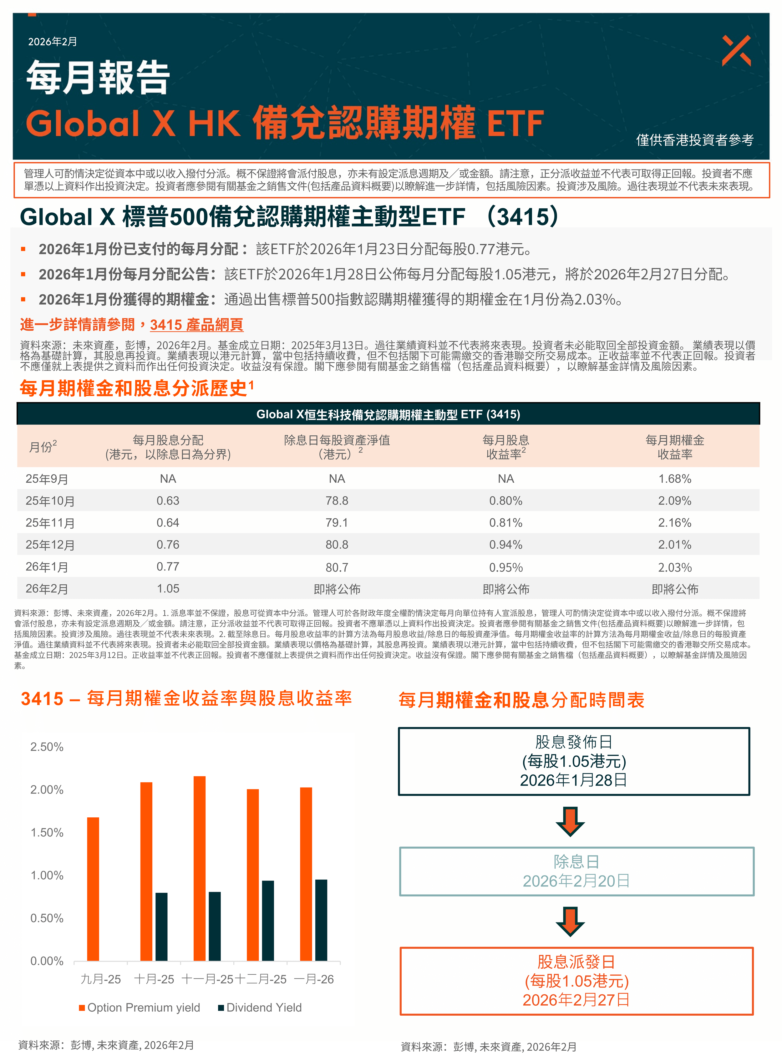 - Global X 標普500備兌認購期權主動型ETF(「本基金」)的投資目標是透過主要(i)投資於標普500指數(「參考指數」)的成份股本證券;及(ii)出售(即「沽出」)參考指數的認購期權以收取認購期權買方支付的款項(即「期權金」),以產生收入。
