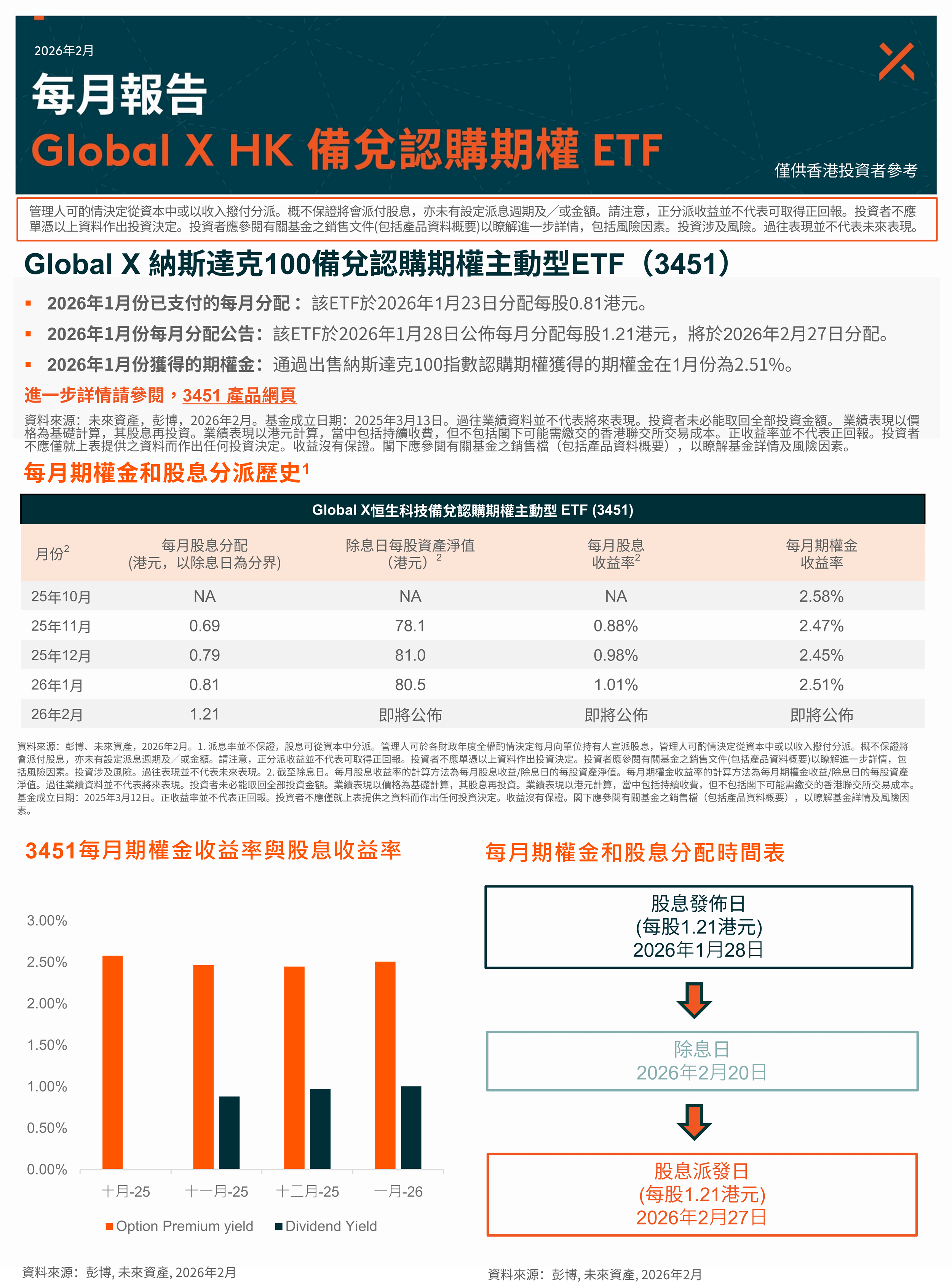 - Global X 納斯達克100備兌認購期權主動型ETF(「本基金」)的投資目標是透過主要(i)投資於納斯達克100指數(「參考指數」)的成份股本證券;及(ii)出售(即「沽出」)參考指數的認購期權以收取認購期權買方支付的款項(即「期權金」),以產生收入。