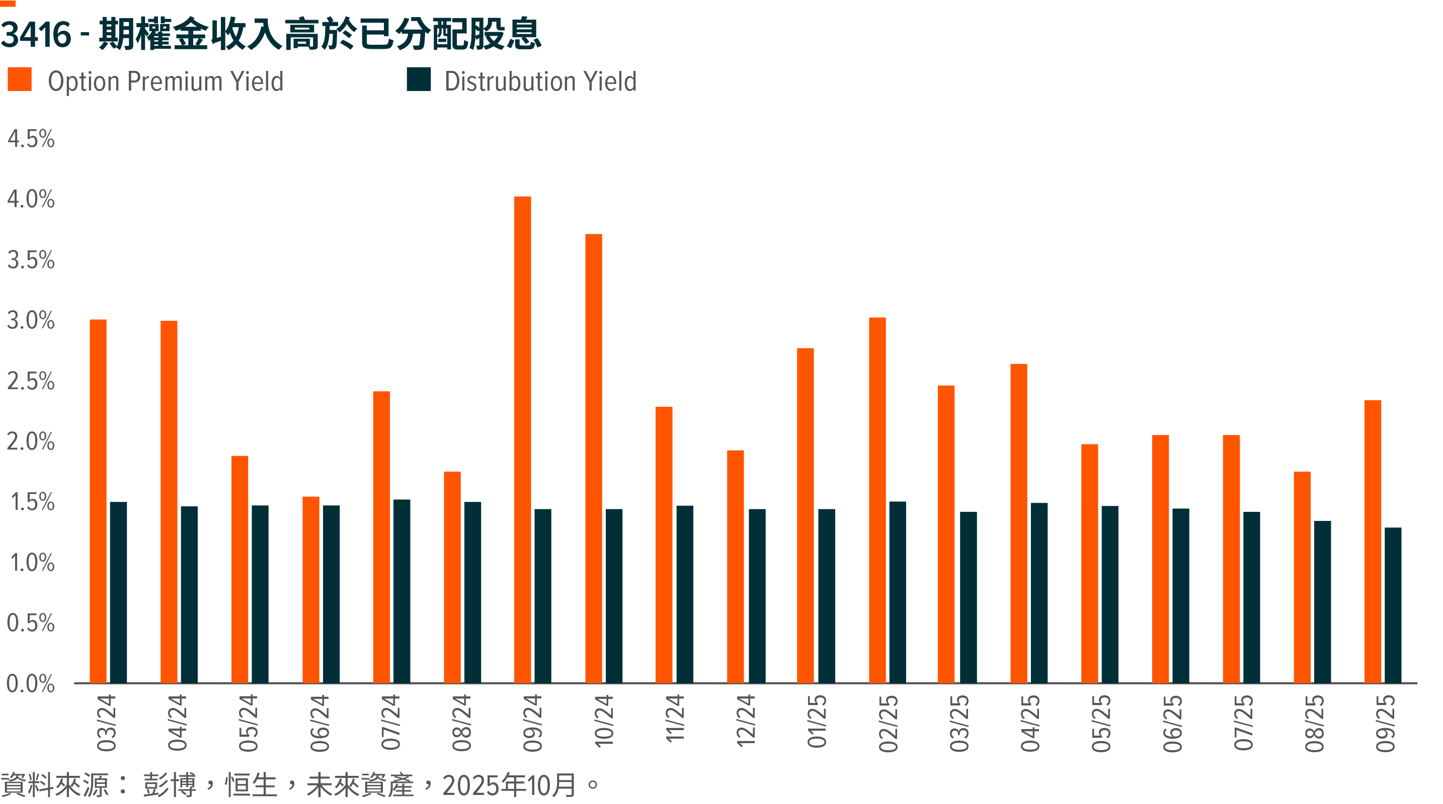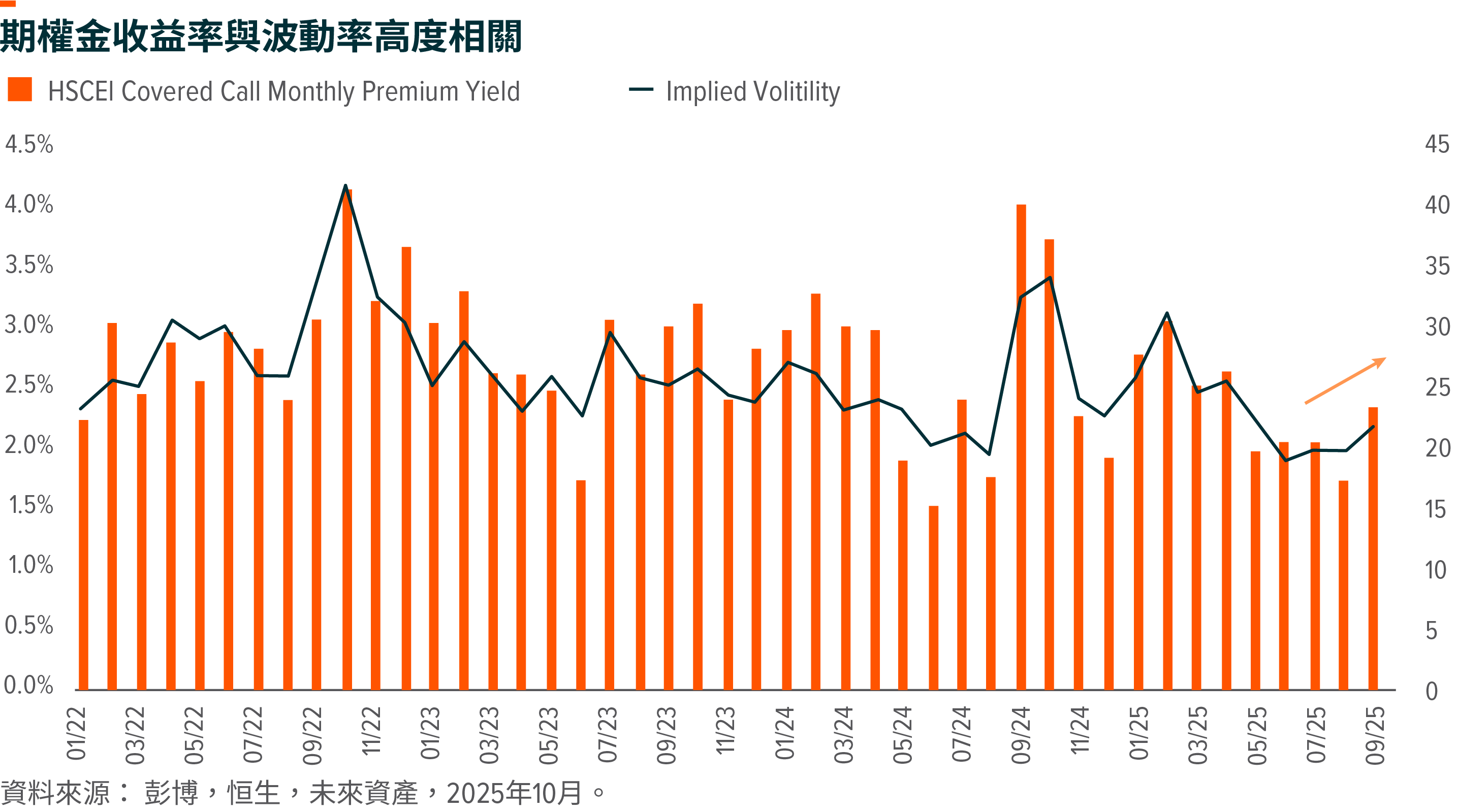 備兌認購期權策略的主要收入來源是出售認購期權所獲得的期權金。期權金往往隨市場波動性的上升而增加,這使得區間震盪市場成為備兌認購期權策略的有利環境。繼四月份上一輪美國關稅威脅引發中國市場反彈後,香港市場波動性在九月份有所上升,導致期權金提高。現階段最新一輪關稅升級的不確定性可能有助於市場波動性持續上升,從而使備兌認購期權策略獲得更高的期權金。