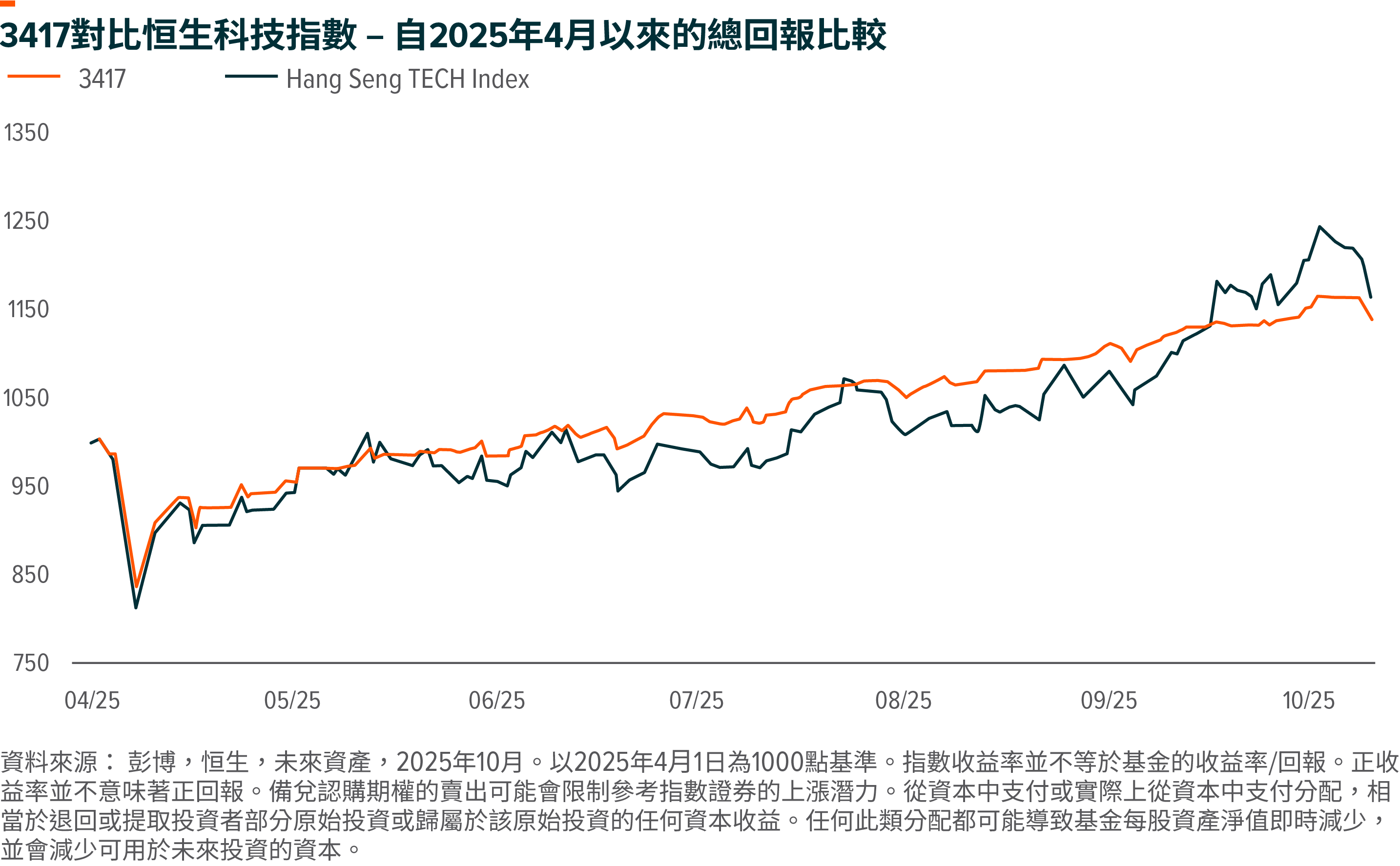 當參考指數下跌時,備兌認購期權策略也會經歷下跌,但由於期權金提供的部分保護,其跌幅較小。回顧四月份的上一輪關稅談判,Global X恒生科技備兌認購期權ETF(3417) 展現出韌性 — 相較於恒生科技指數,該基金的調整幅度較為溫和,並在市場氣氛改善後出現回升。由於Global X備兌認購期權ETF旨在通過出售每月認購期權來支付每月股息(旨在每月派息,派息率並不保證,股息可從資本中分派#),近期的調整可能為這些ETF提供有利的買入機會,並可能帶來更高的每月股息收益率。