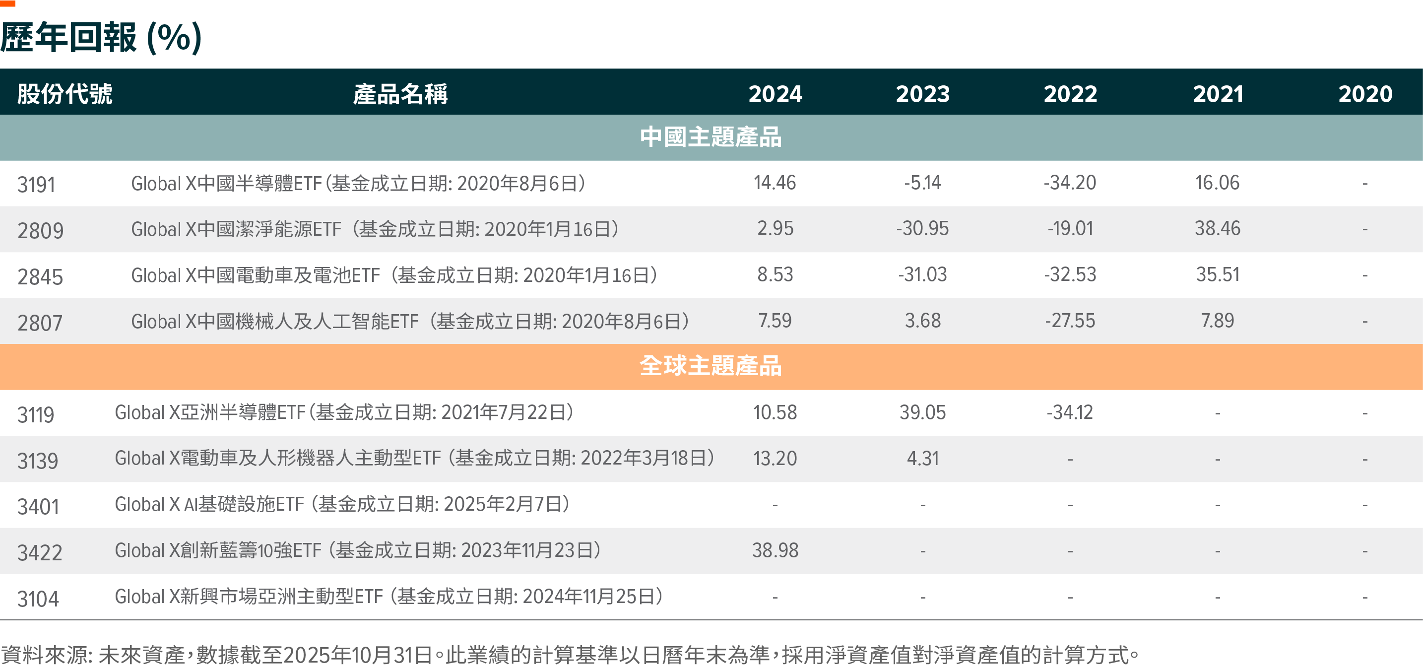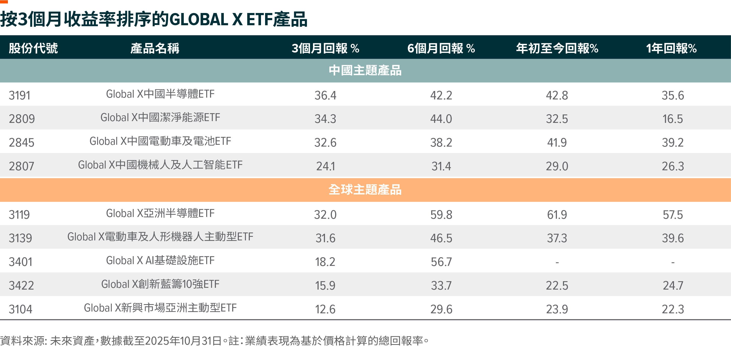 本文重點梳理了Global X ETFs中過去三個月表現最突出的產品。截至10月底,在中國主題性產品中,Global X 中國半導 體ETF(3191)Global X 中國潔淨能源 ETF(2809)Global X 中國電動車及電池 ETF(2845)領跑市場;在全球主題性產品中,Global X 亞洲半導體 ETF(3119)Global X 電動車及人形機器人主動型ETF (3139)Global X AI基礎設施 ETF(3401)表現突出,下文將深入剖析推動其近期增長的核心驅動力。